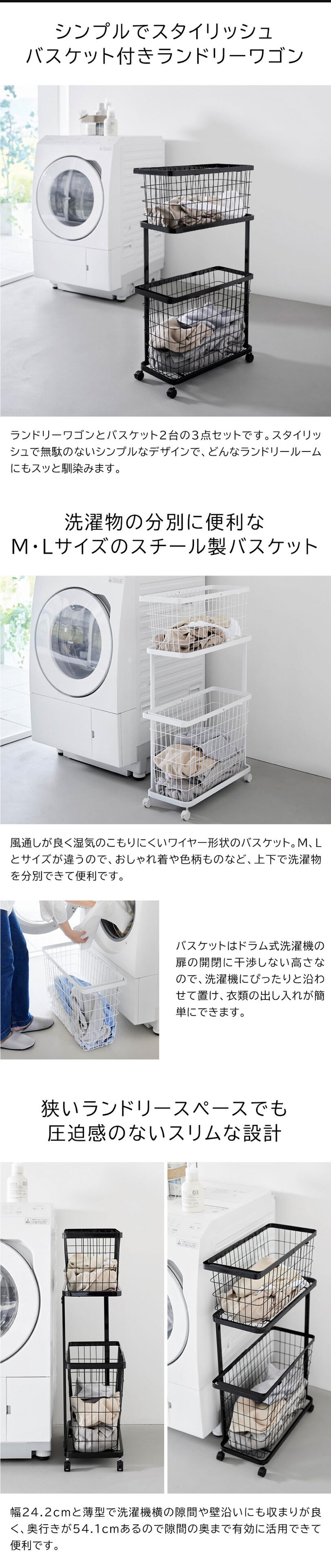商品サイズ W24.2×D54.1×H90.4cm(キャスター含む) ワゴン:W22.5×D53×H68cm バスケットM:W23×D53×H24.7cm バスケットL:W23×D53×H36.7cm |