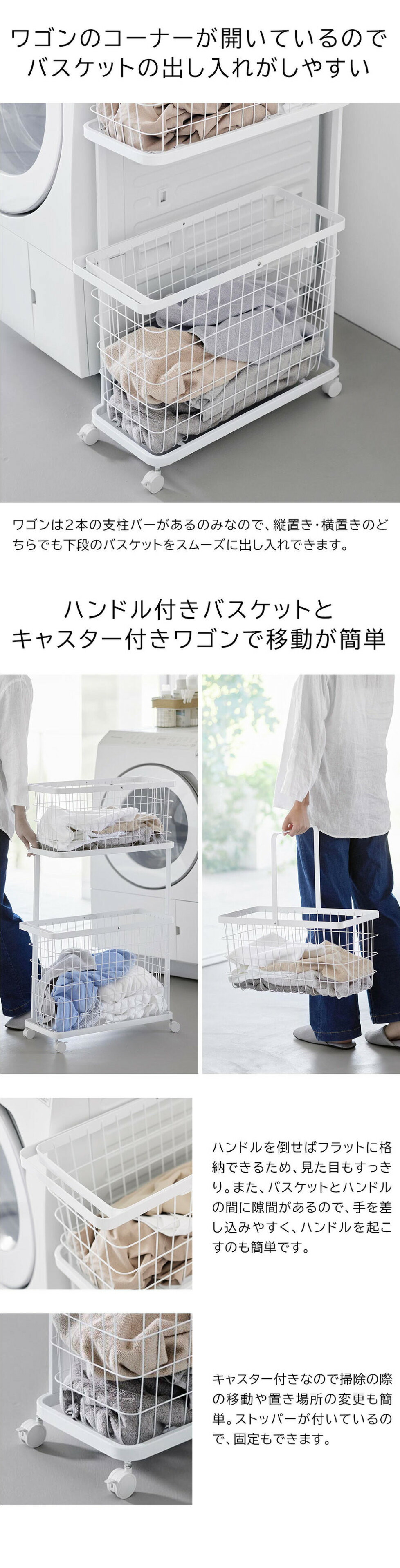 シンプルでスタイリッシュなワイヤーバスケット2台を収納できるランドリーワゴンセットです。隙間にフィットするスリム設計で、縦置き、横置きどちらでもバスケットをスムーズに取り出せます。