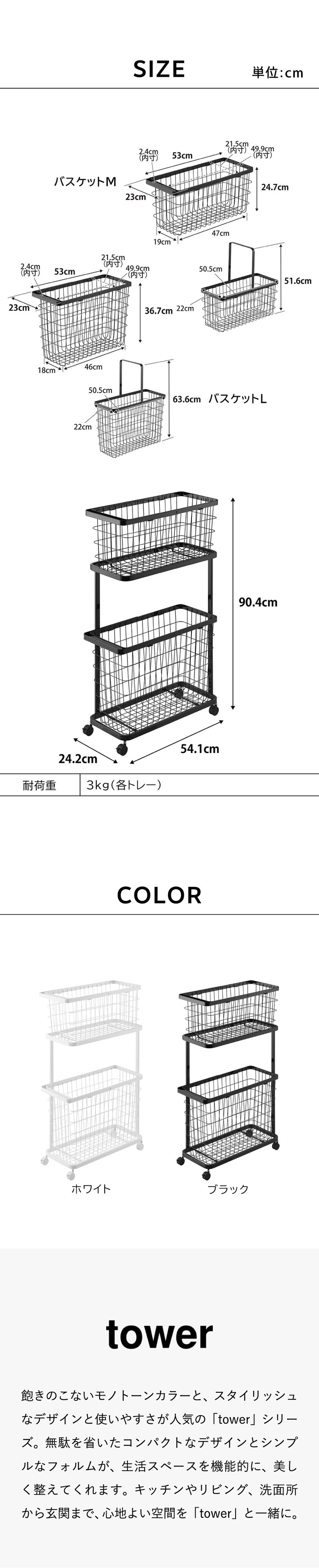 耐荷重 ワゴン:6kg(トレー1段あたり) バスケットM:3kg バスケットL:4kg (静止荷重) |