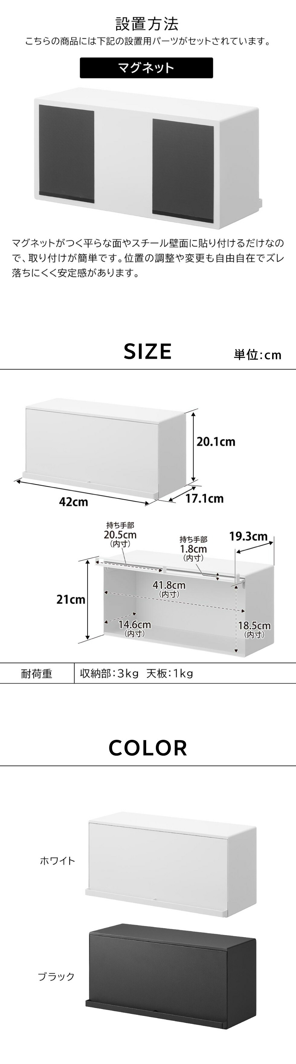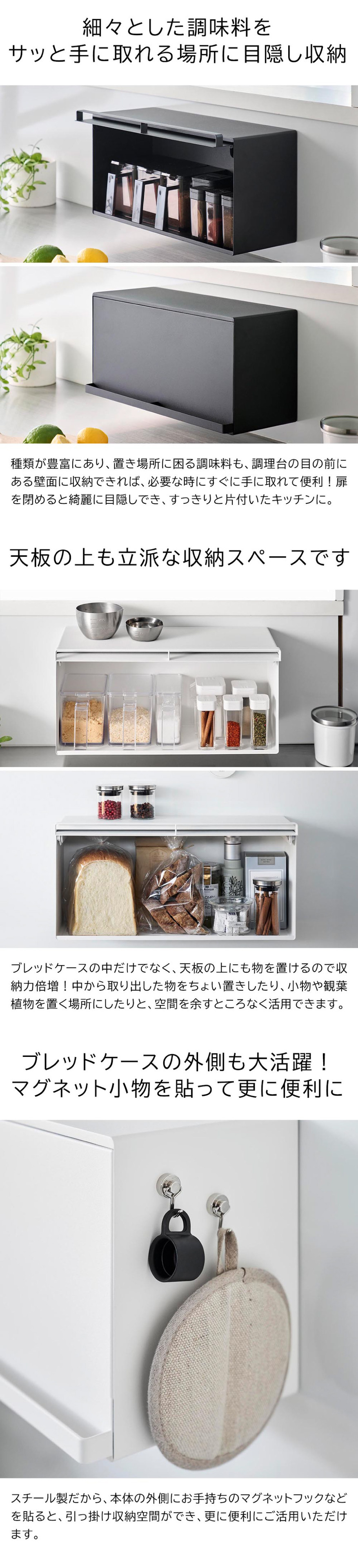 マグネットのつくキッチンパネルや冷蔵庫などにペタッと貼るだけの簡単設置!デッドスペースにパンや調味料などをたっぷりと収納できるスタイリッシュな浮かせるブレッドケース。