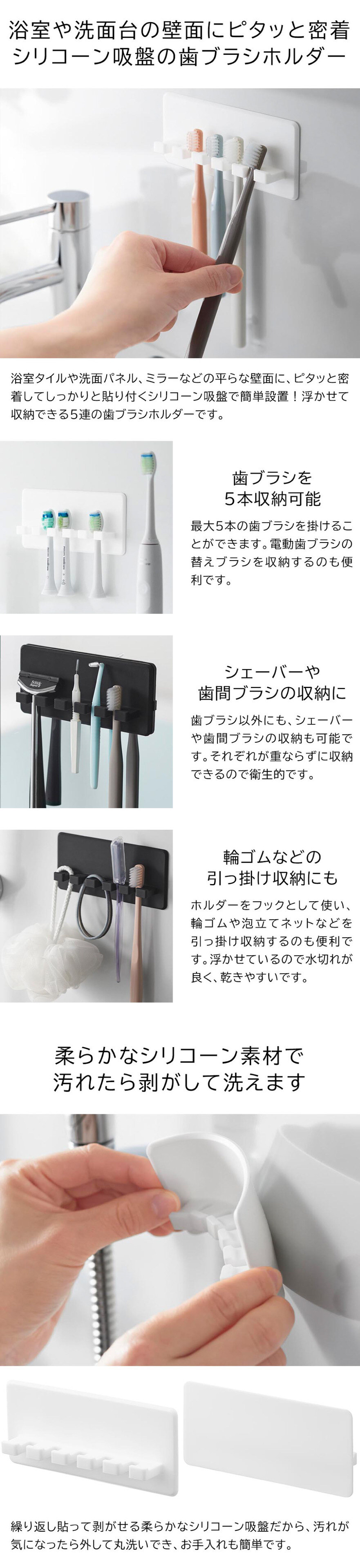 シリコーン吸盤で貼り付けるだけ!浮かせて衛生的に収納できる歯ブラシホルダー5連です。柔らかい素材なのでお手入れしやすく清潔!