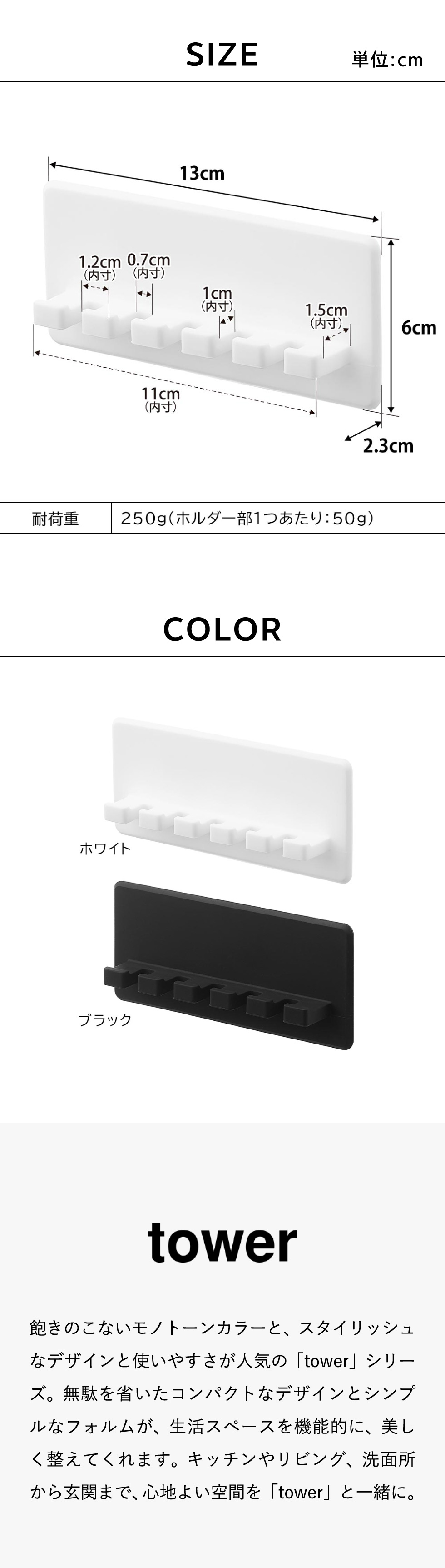 耐荷重 250g(ホルダー部1つあたり:50g)(静止荷重) |