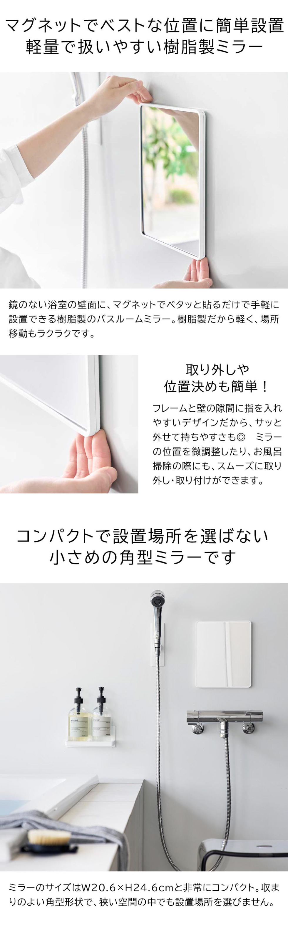落としても割れにくい樹脂ミラー角型です。マグネットでお好みの場所に簡単に設置できます。曇り止め加工を施した厚さ6mmの樹脂製バスルームミラーで、ゆがみにくく衝撃にも強い仕様です。フレームと壁の隙間に指を入れやすい形状で、取り外しも簡単。お掃除がしやすく清潔に保てます。さらに、曇り止めフィルムを全面に粘着加工しているため、快適にお使いいただけます。