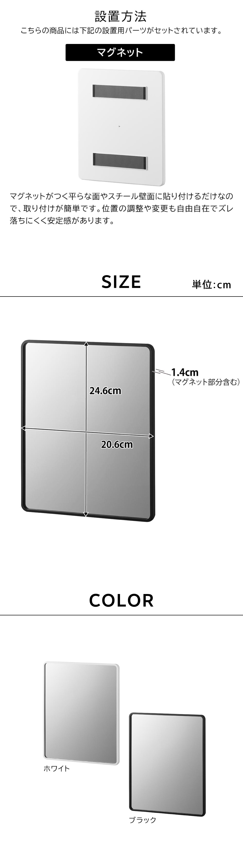 品質表示 フレーム:ABS樹脂 マグネット 滑り止め:シリコーンゴム ミラー:ポリスチレン 表面フィルム:PET |