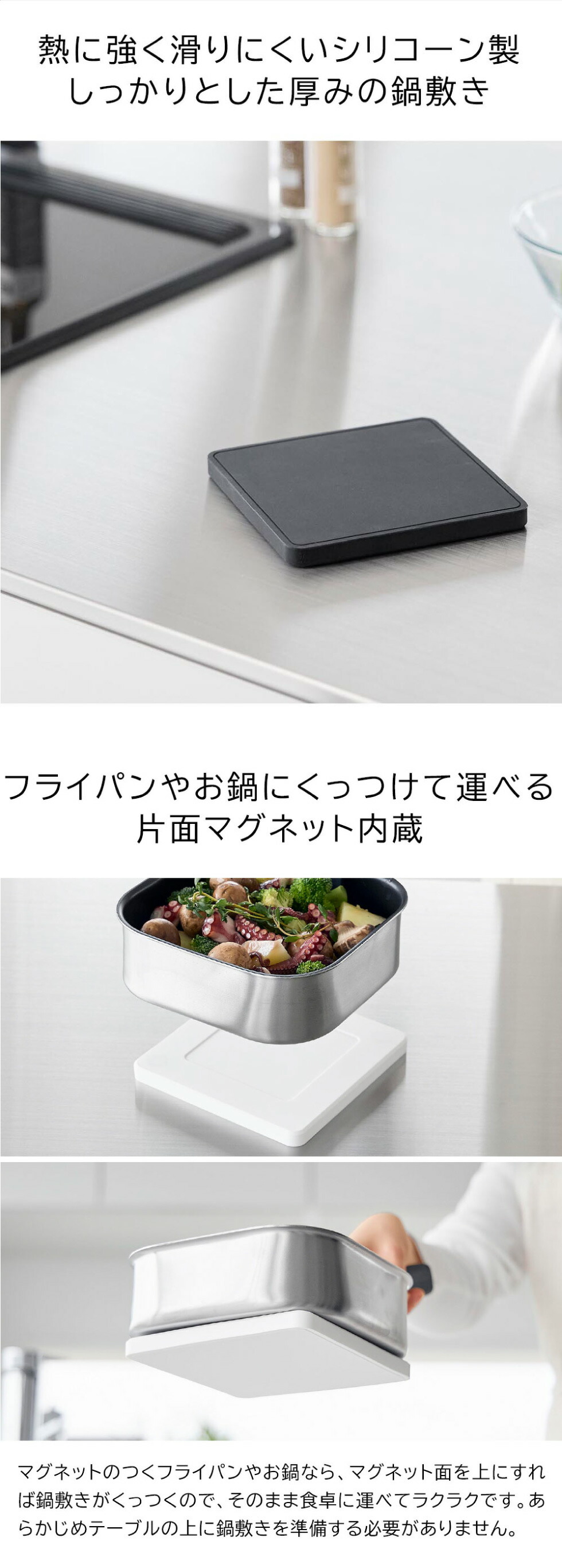 熱に強く滑りにくいシリコーン製の四角い鍋敷き。マグネットを内蔵しているのでスチール面にくっつけてピタッと収納。お鍋にくっつけてそのまま食卓へ運べて便利。 yamazaki