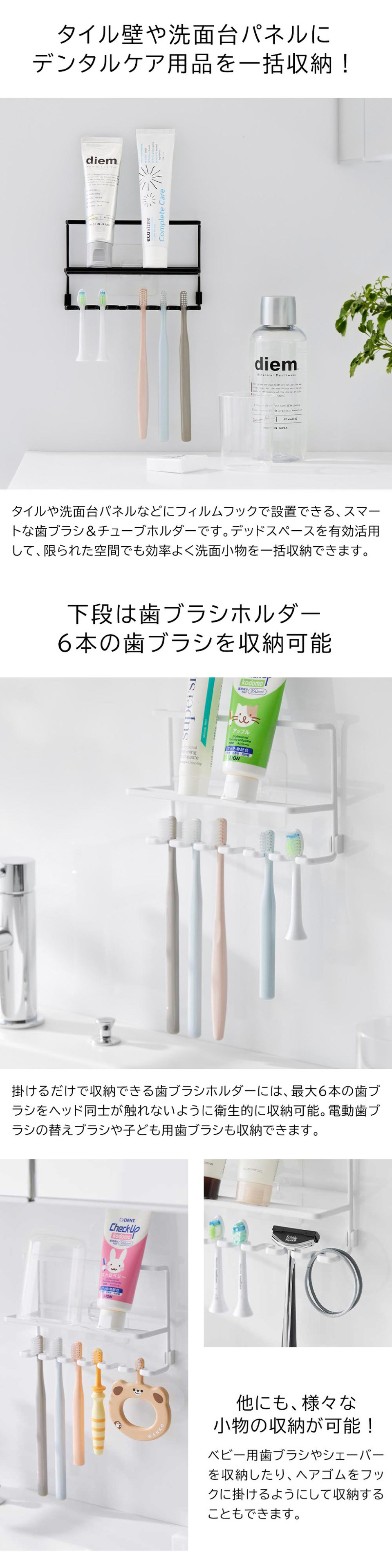 フィルムフックで簡単に取り付けできる歯ブラシ&チューブホルダーです。浮かせて収納できるので乾きやすく衛生的。コップやお子様用グッズもしっかり水切れし、清潔に収納できます。設置場所を工夫すれば長いチューブも収納可能で、置き場所に困るマウスピースの乾燥スペースとしても便利です。貼り付けたフィルムフックに掛けるだけの簡単設置。