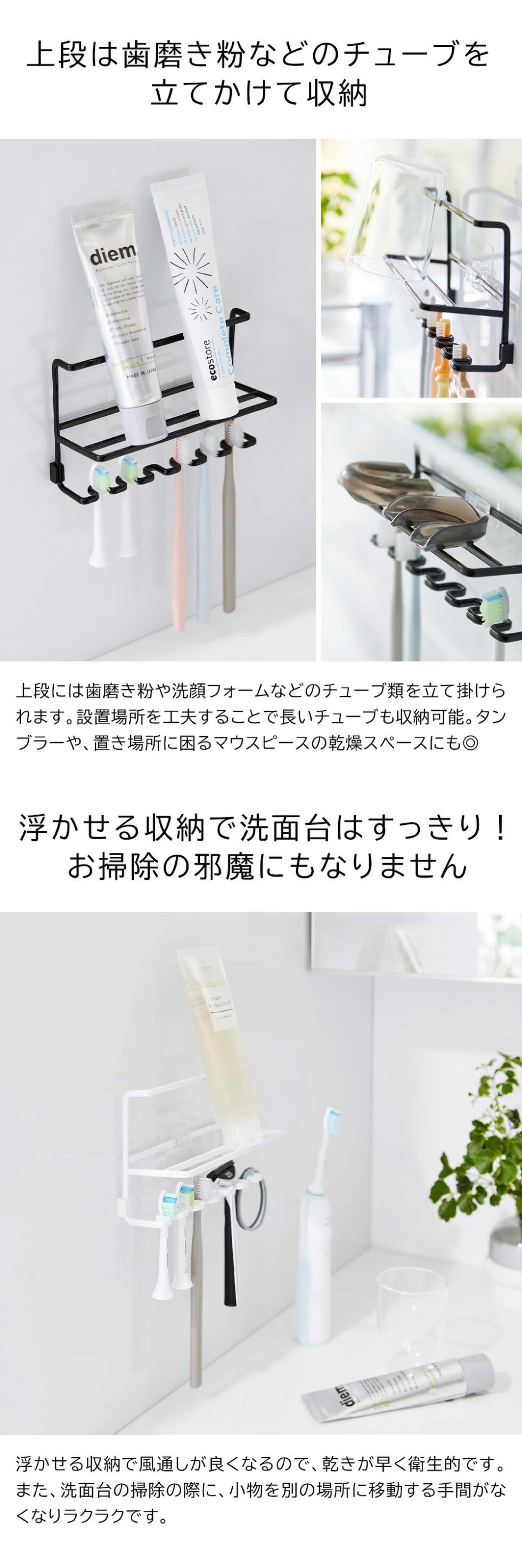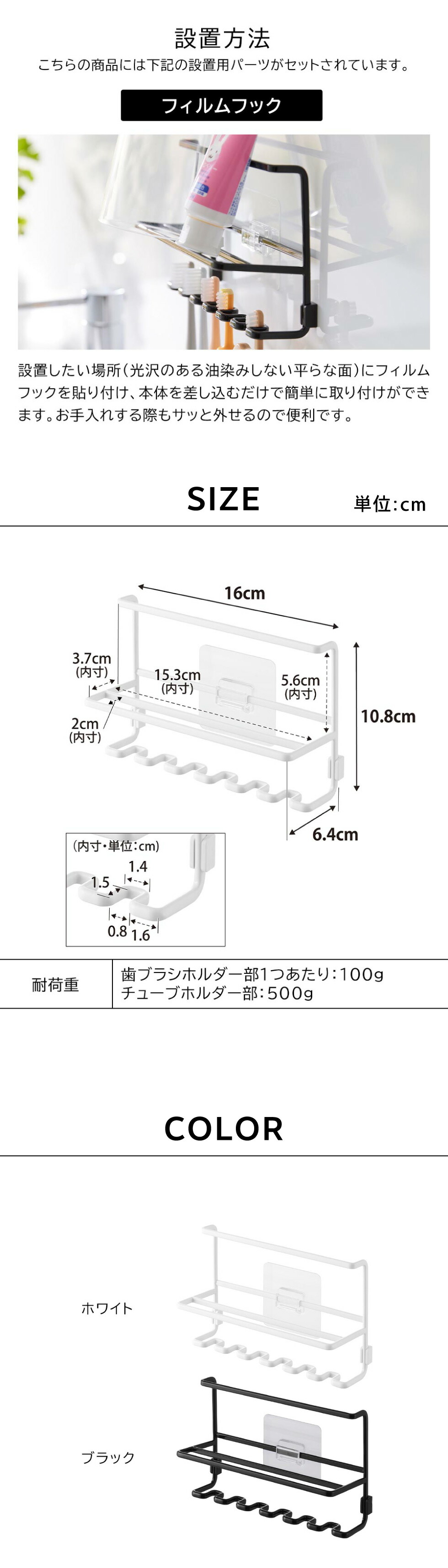 耐荷重 歯ブラシホルダー部1つあたり:100g チューブホルダー部:500g (静止荷重) |