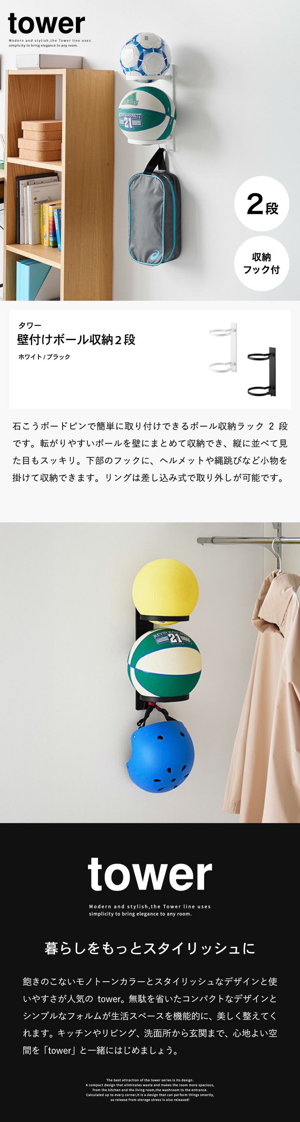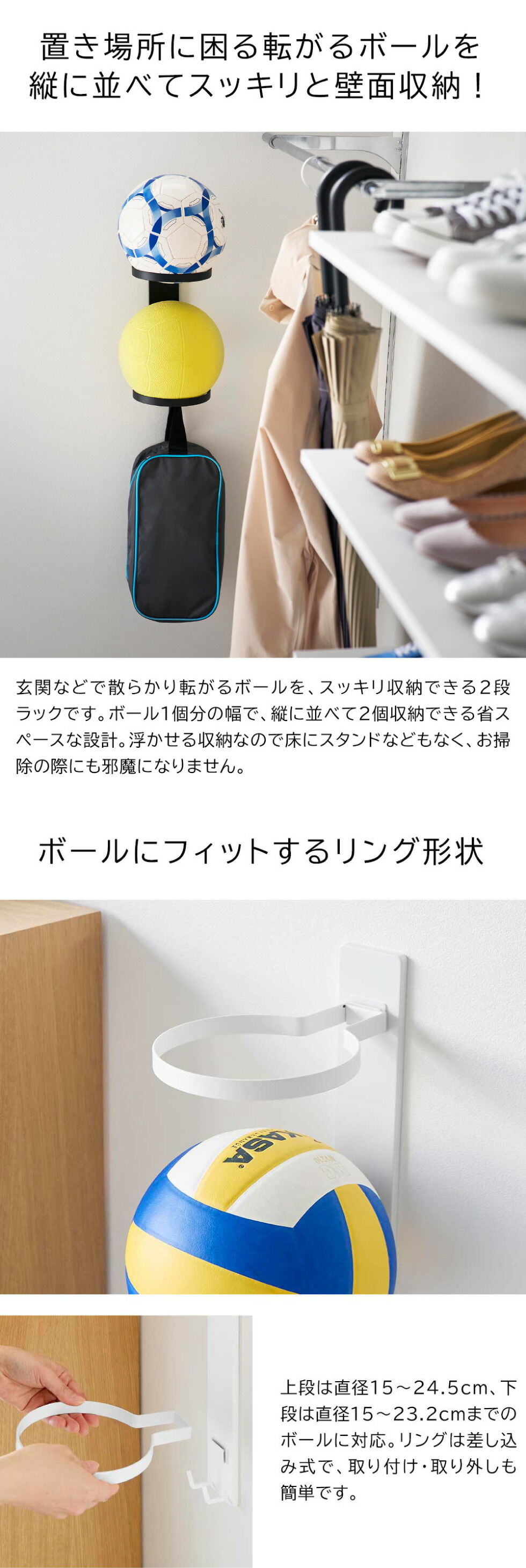 石こうボードピンで簡単に取り付けできる、ボール収納ラック2段です。転がるボールを壁にまとめて収納でき、縦に並べて見た目もスッキリ!下部にはフックが付いており、ヘルメットや縄跳びなどの小物収納にも便利です。リングは差し込み式で取り外しが可能。壁の穴が目立ちにくい石こうボードピンで簡単に設置でき、ウォークインクローゼットや勉強部屋など、さまざまな場所で活躍します。