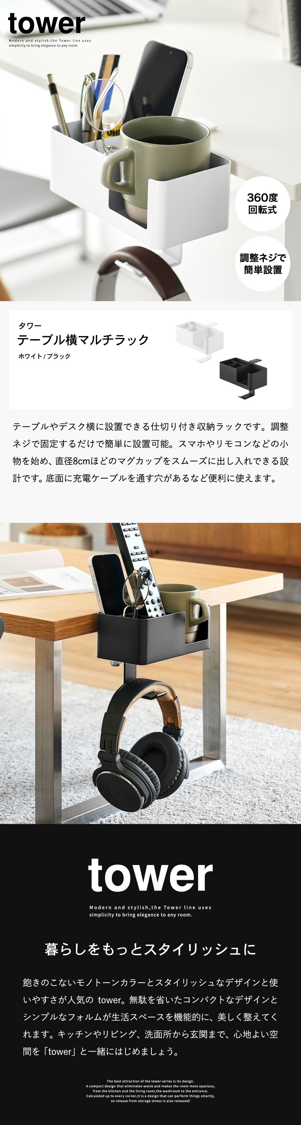 ホワイトとブラックを中心とした飽きのこないモノトーンカラーと、どんなインテリアにもスッと馴染むスタイリッシュなデザイン。そして、とことんシンプルながら、より豊かな暮らしを提案するアイデアがたくさん詰まった、使いやすいアイテムが人気です。無駄を省いたコンパクトなデザインと、シンプルなフォルムが生活スペースを機能的に、美しく整えてくれます。towerのアイテムをライン使いすれば、すっきりとした統一感が生まれ、お洒落でシックな雰囲気を演出します。キッチンやリビング、洗面所から玄関まで揃えたくなるtowerシリーズで、毎日の暮らしを彩る心地よい空間を。