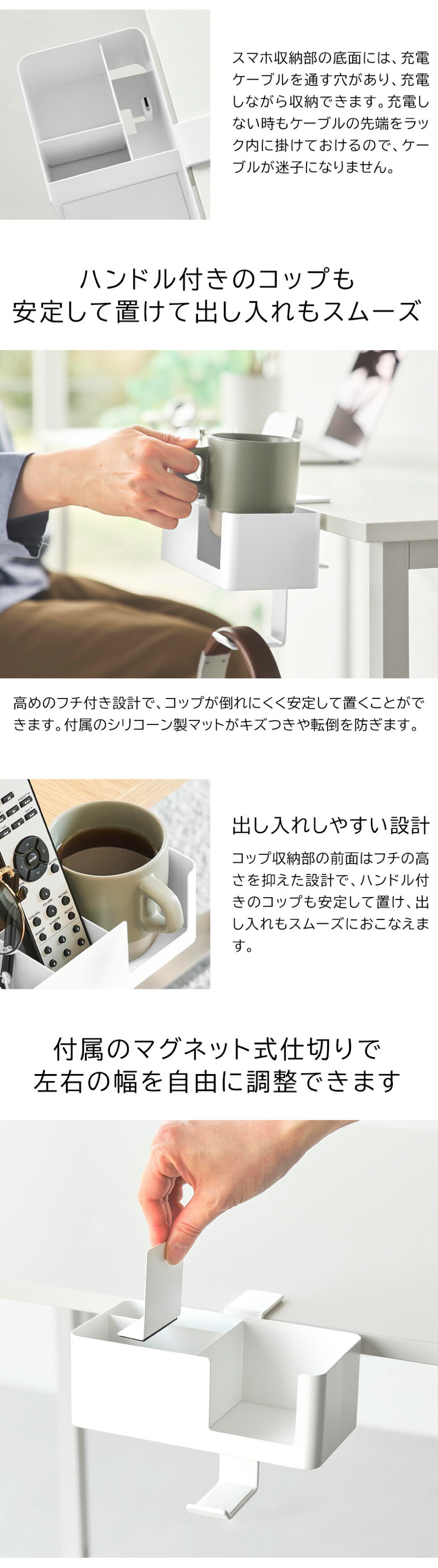 テーブル横に簡単に取り付けできる、便利な収納ラックです。クランプ式の固定構造でしっかりと設置できます。マグカップやスマートフォン、リモコン、メガネなど、置き場所に困る生活小物をまとめてスッキリ収納。ハンドル付きのコップも安定して置けるデザインで、シリコーン製マットがキズや転倒を防ぎます。スマートフォンを収納しながら充電することもでき、充電しないときは、ケーブルの先端を引っ掛けておくことができます。フックにはヘッドホンなどを掛けられて便利。マグネット付きの仕切りは、収納物に合わせて自由に位置を調整できます。