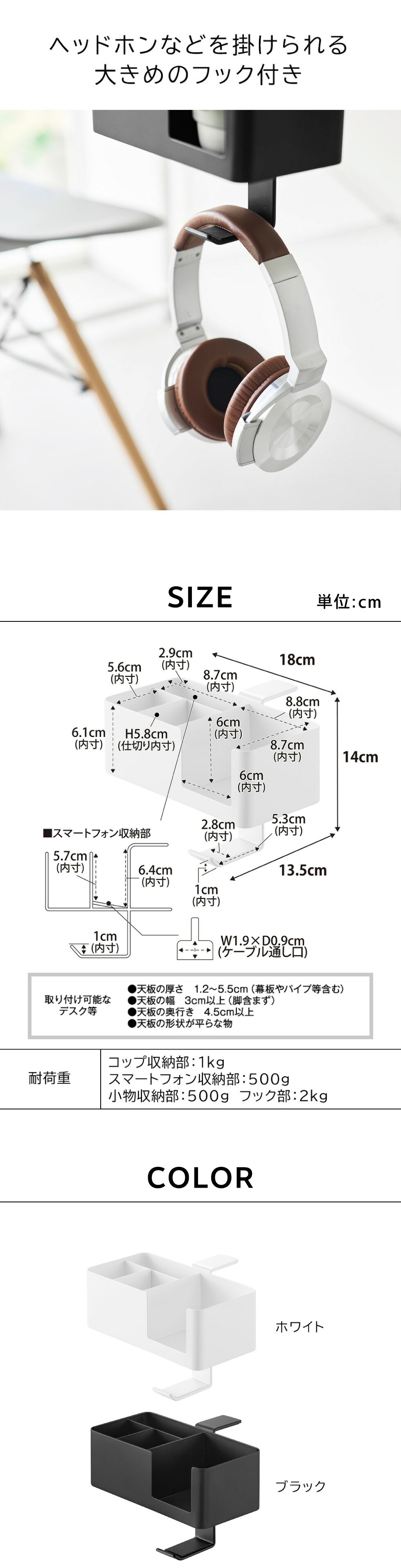 ■取り付け可能な場所 天板の厚さが1.2~5.5cm(幕板やパイプ等を含む) 幅3cm以上(脚含まず) 奥行4.5cm以上の平らなデスク等 ※設置場所の構造や材質、形状によっては取り付けできない場合があります。 |