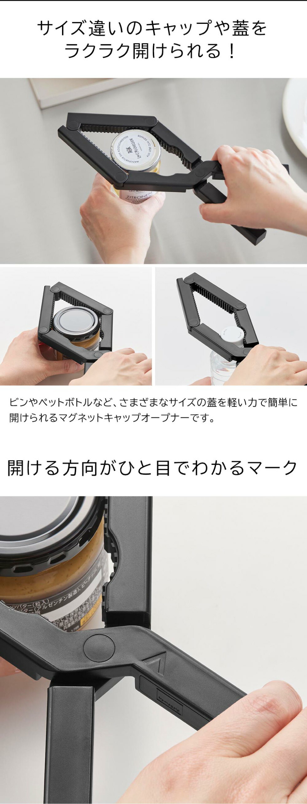様々なサイズの蓋に対応し、軽い力で簡単に開けられるマグネットキャップオープナーです。ビンやペットボトルの蓋をしっかりホールドできるので、力の弱い方やネイルをしている方にも安心してお使いいただけます。使わないときはマグネットで貼り付けてすっきり収納可能。さらに、開ける方向がひと目でわかるマーク付きで、より使いやすい設計です。