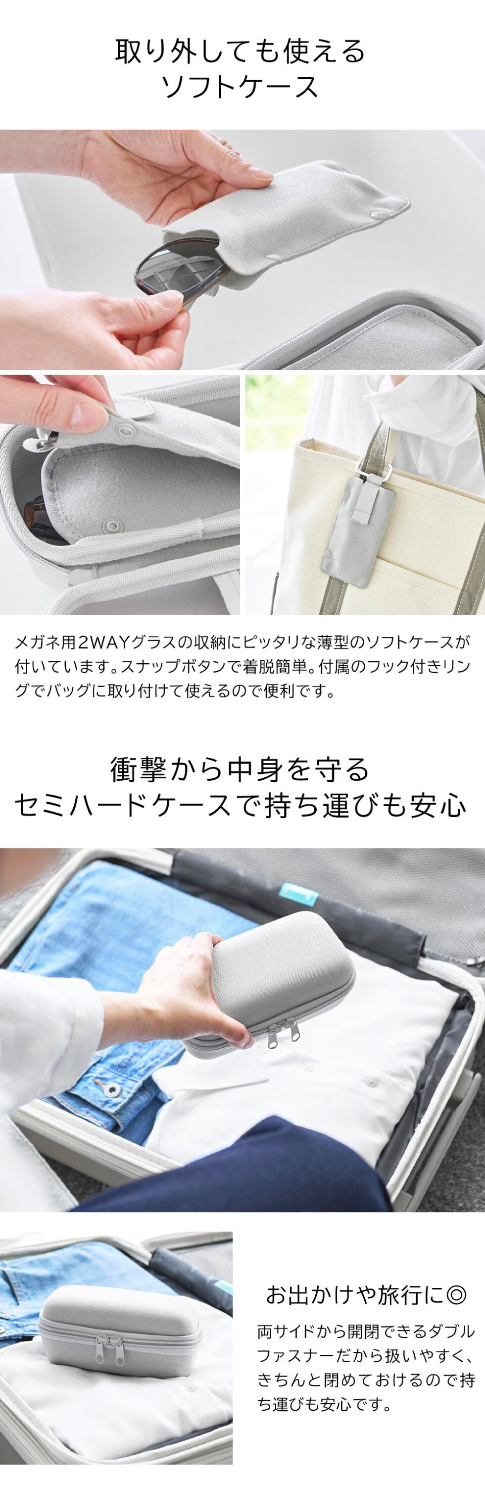 メガネやコンタクト用品をまとめてスッキリ収納できる、持ち運びに便利なケースです。ちょっとした衝撃にも安心なセミハードケースで、旅行や外出にもおすすめ。2WAYグラス収納にも便利なソフトケース付きで、用途に合わせて使い分けができます。