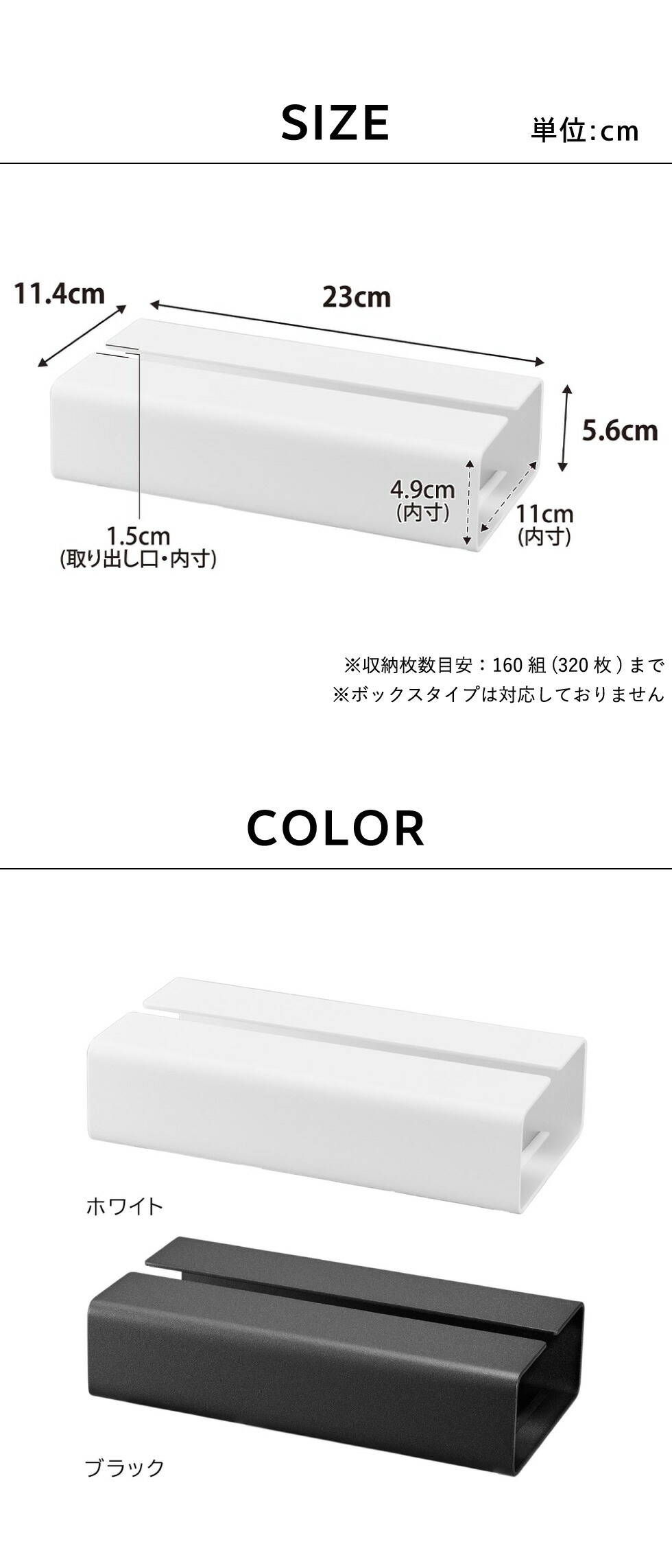 対応サイズ 収納枚数の目安 160組(320枚)までのソフトパックティッシュペーパー ※ボックスタイプは対応しておりません。 ※ティッシュペーパーのサイズや形状によっては収納できない場合があります。 |