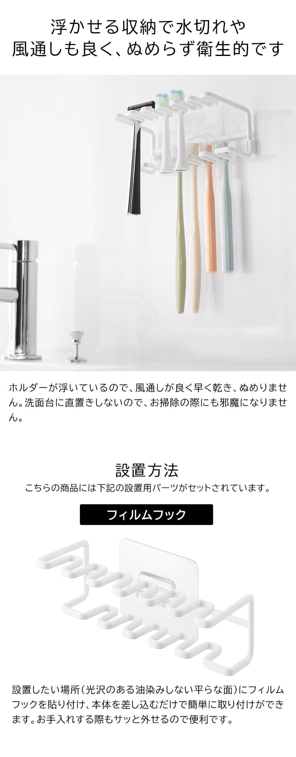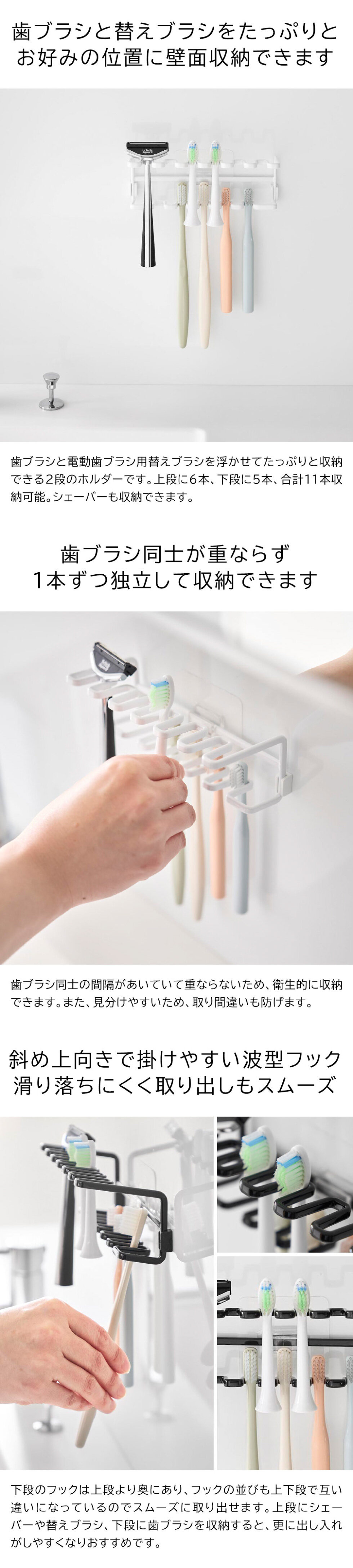 フィルムフックで簡単取り付け!2段でたっぷり収納できる歯ブラシ&替え歯ブラシホルダーです。上下で奥行きが異なる設計なので、スムーズに出し入れできます。