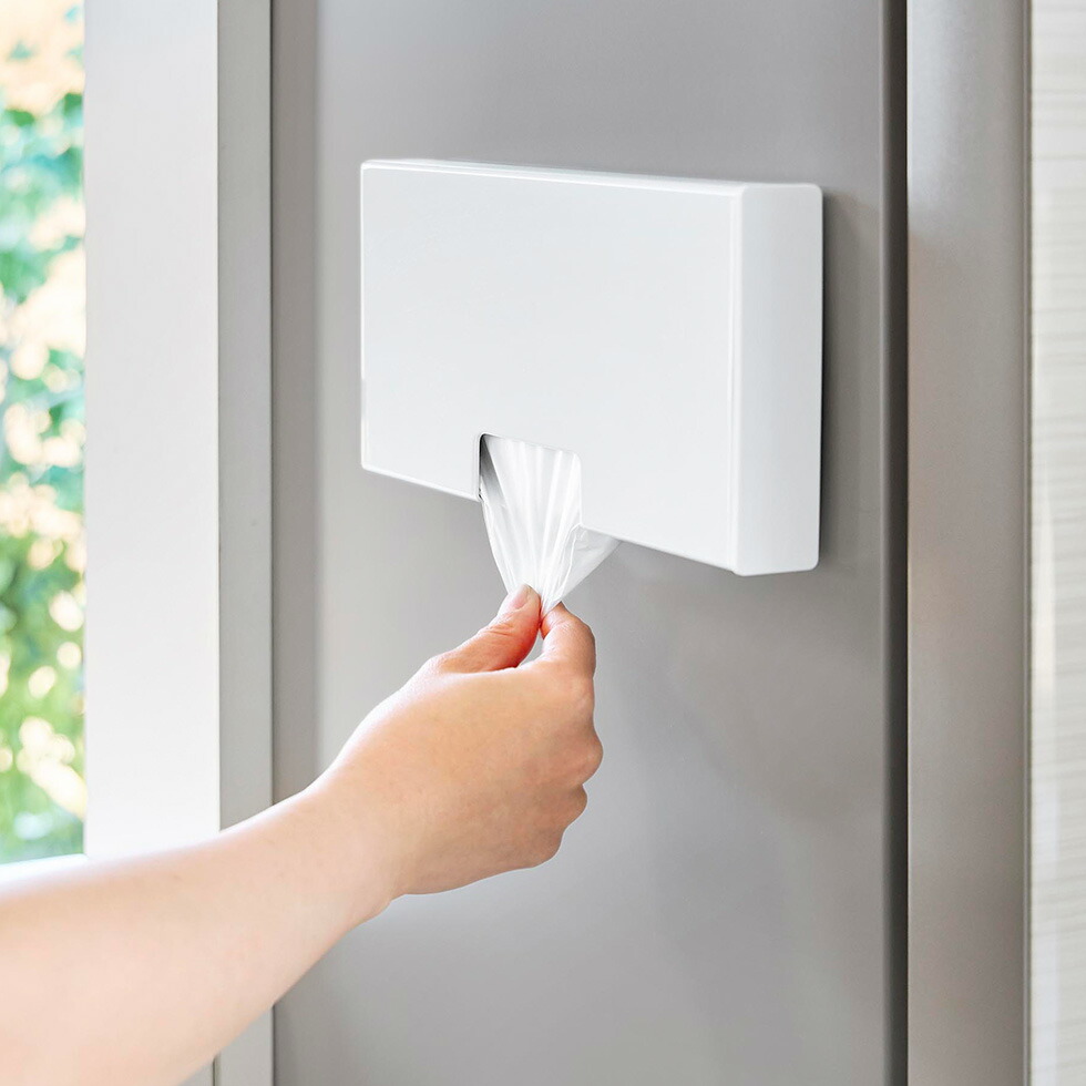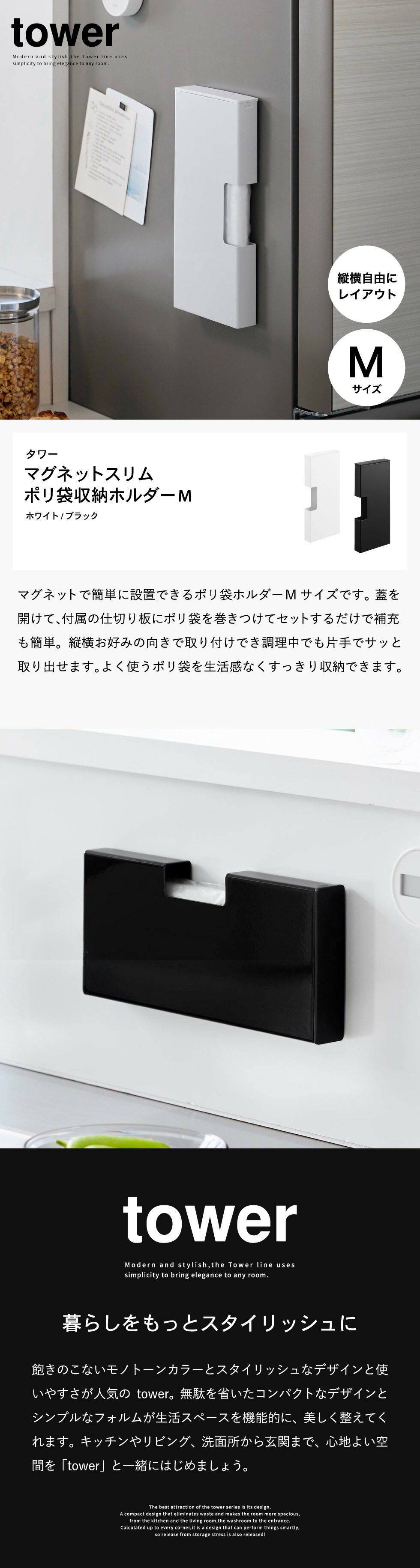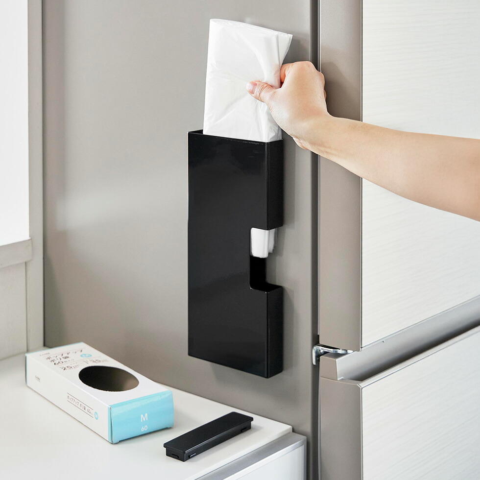 マグネットで簡単に設置できる、ポリ袋ホルダーMサイズ。蓋を開けて入れるだけで補充もスムーズ。縦横お好みの向きに取り付け可能 キッチン収納 タワーシリーズ yamazaki