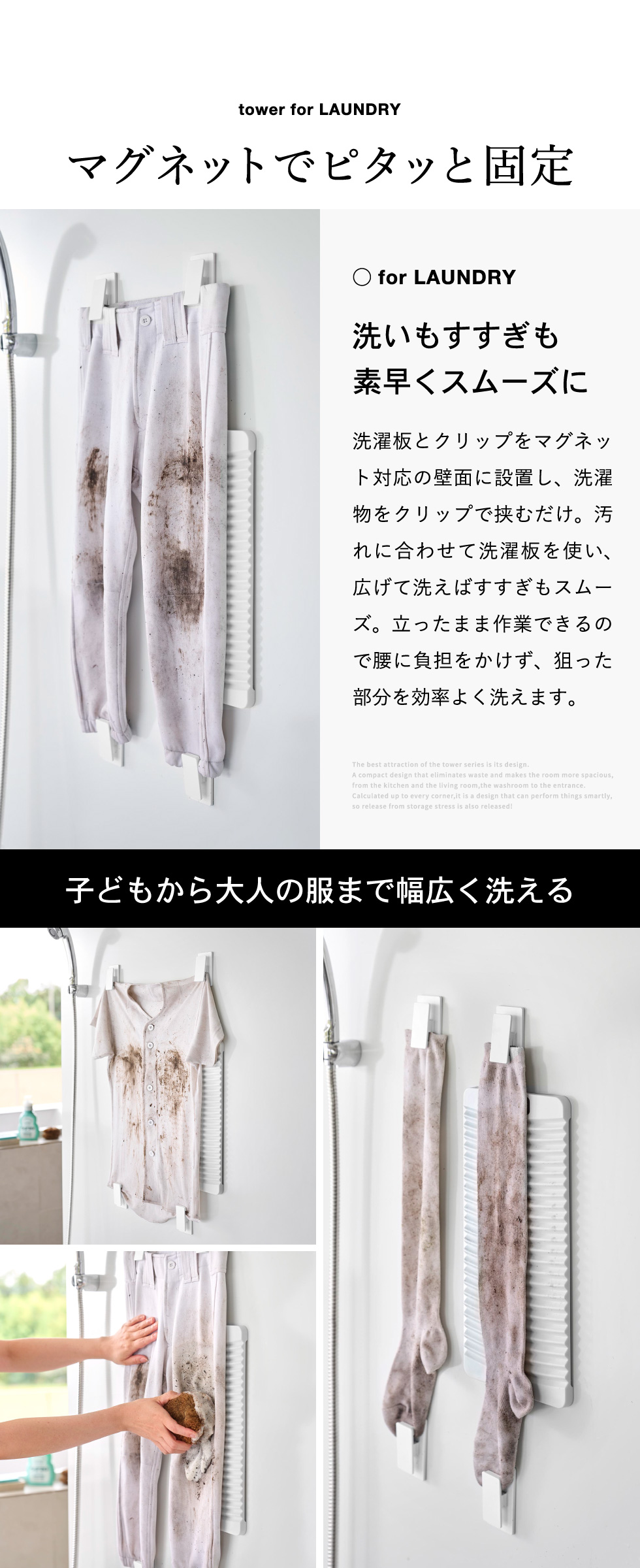 泥だらけのユニフォームを楽な姿勢で洗える、マグネット洗濯板&クリップです。使いたい時にサッと取り出せて便利。洗濯物を広げてクリップで固定し、洗濯板で擦り洗いできます。腰をかがめず無理のない姿勢で作業でき、汚れの位置に合わせて洗濯板の位置を調整できるため、広い範囲も洗えます。お風呂場でシャワーを流しながら汚れを落とせ、タワシを使えば衣類の前後を同時に洗えるので、より効率よく汚れを落とせます。洗濯以外の用途にも使える便利なクリップ付きです。