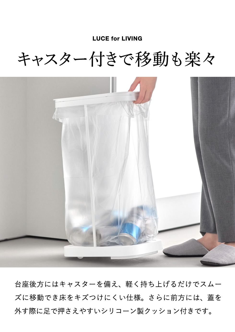 横開きの大開口で捨てやすい、キャスター付き分別ゴミ袋ホルダーです。棚下にもスッキリ収まり、フレーム構造によりゴミ袋の容量を無駄なく活用できます。蓋は取り付け向きを変えることで左右どちら開きにも対応。蓋開口時の高さは最大77.5cmで、大きく開くため捨てやすい設計です。複数並べて、ペットボトル・空き缶・資源ゴミなどの分別にも最適。蓋付きなので、においも軽減できます。台座後方にはキャスターが付いており、軽く持ち上げるだけでスムーズに移動可能。床にキズがつきにくい仕様です。また、台座前方には蓋を外す際に足で押さえやすいシリコーン製クッション付き。ゴミ袋の取り付けも簡単で、袋を掛けて蓋をするだけ。交換時も蓋を外し手前から引き抜くだけで、ゴミ袋の交換がラクに行えます。
