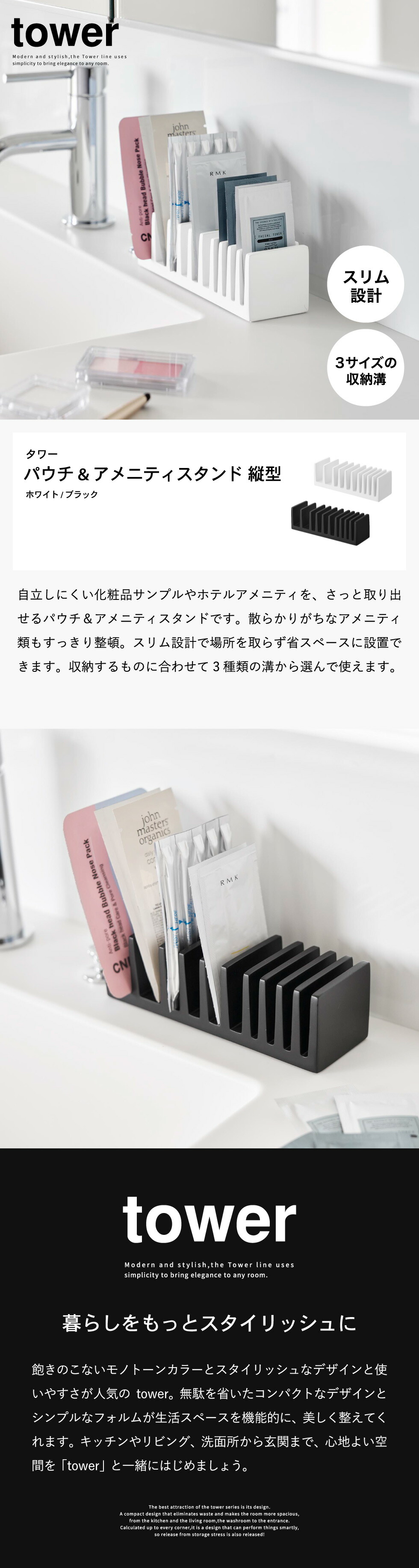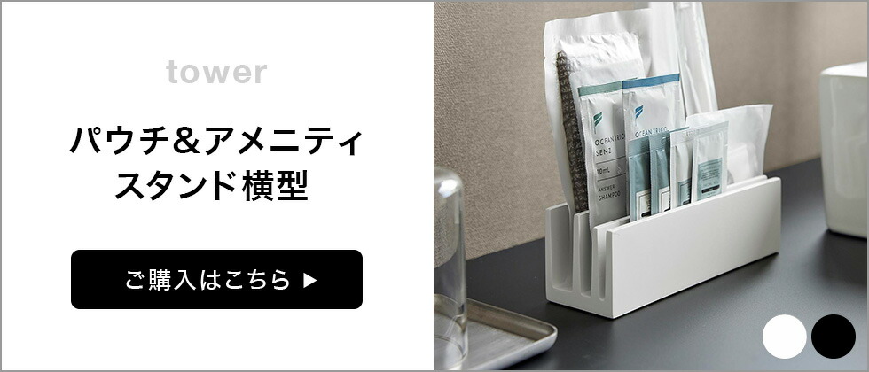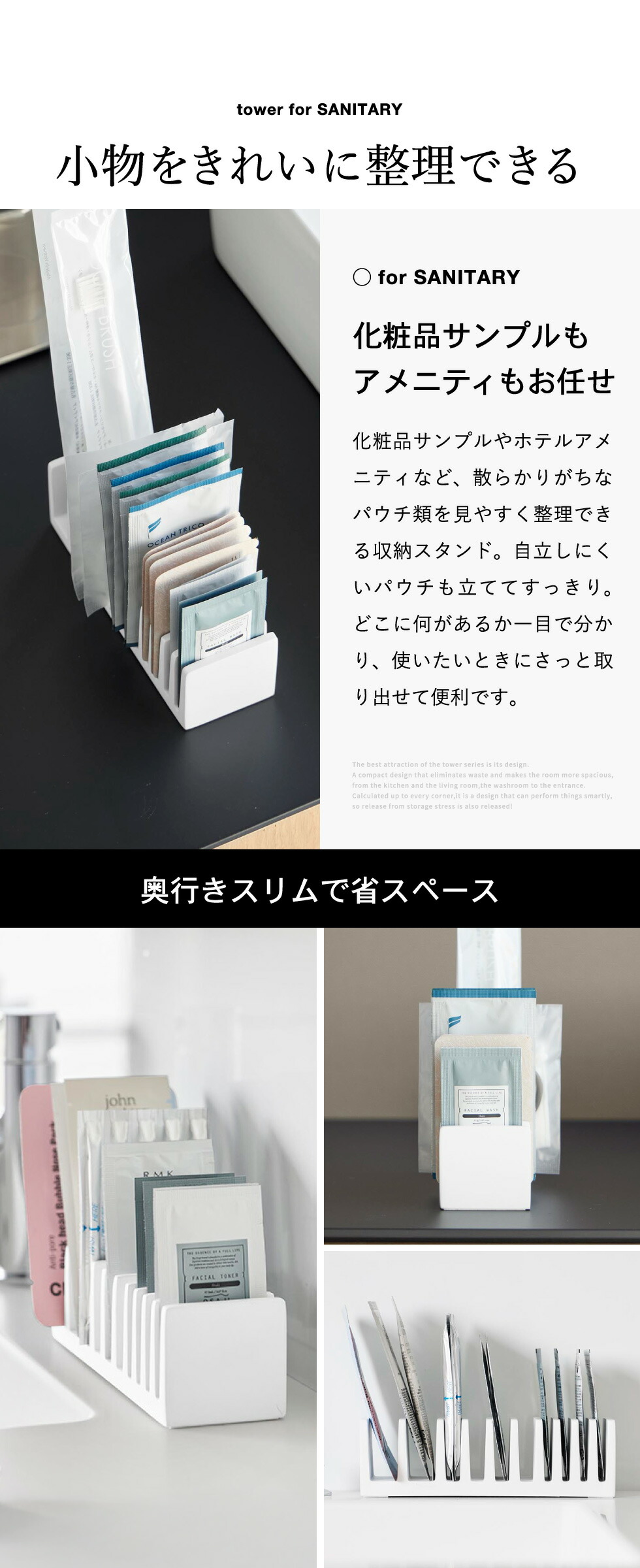 化粧品サンプルやホテルアメニティを、見やすく整理してサッと取り出せるパウチ&アメニティスタンドです。アメニティをすっきり美しく整え、スリム設計なので場所を取らず省スペースに設置できます。化粧品サンプルも使いやすく収納できます。