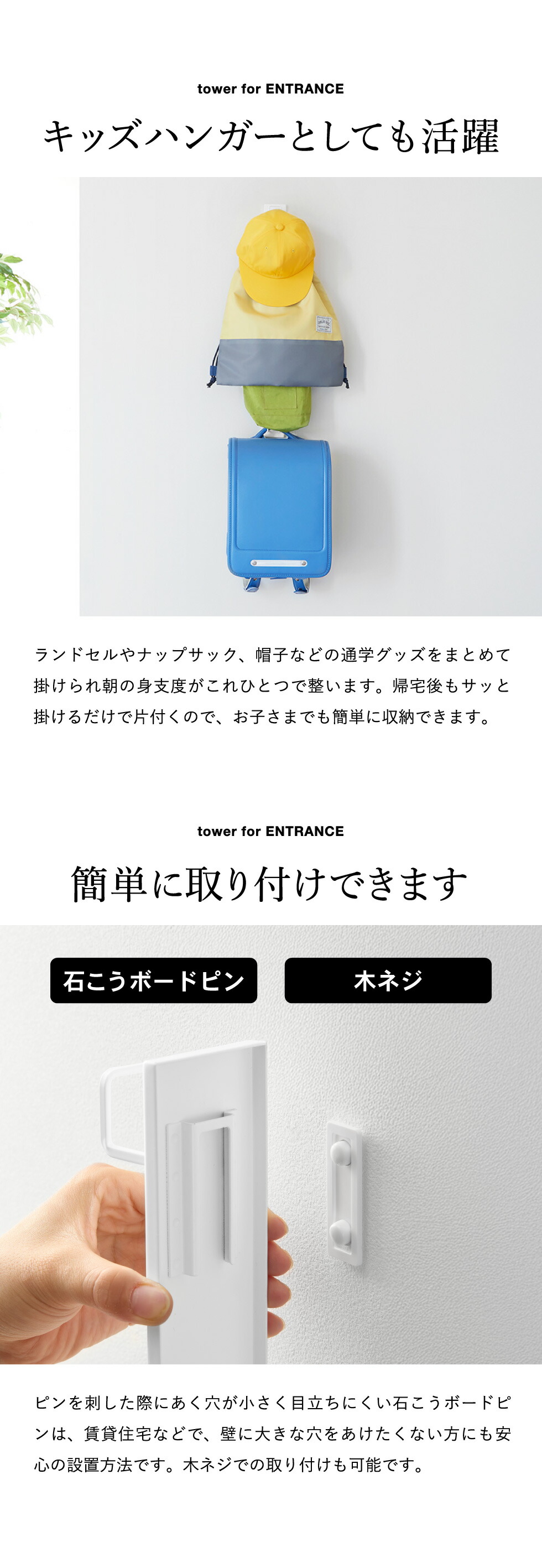 石こうボードピンで簡単に取り付けできる、縦型の壁付けハンガーです。収納に困りがちなリュックを縦に重ねて掛けられ、省スペースに収納できます。手に取りやすい位置に掛けられるため、外出時の持ち出しもスムーズで便利。ハンドバッグや帽子、ランドセルの持ち手部分を引っ掛けて、通学グッズをまとめて収納するのもおすすめです。壁の穴が目立ちにくい石こうボードピンで簡単取り付け。木ネジでも取り付け可能。