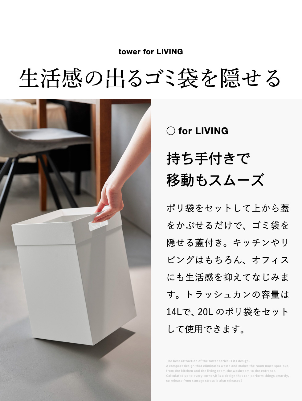 フチカバーと持ち手付きのスクエア型トラッシュカンです。持ち手が付いているので移動もスムーズ。フチカバーはゴミ袋をすっきり隠せる仕様です。
