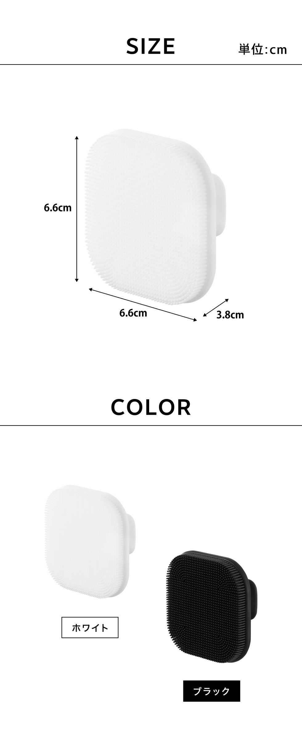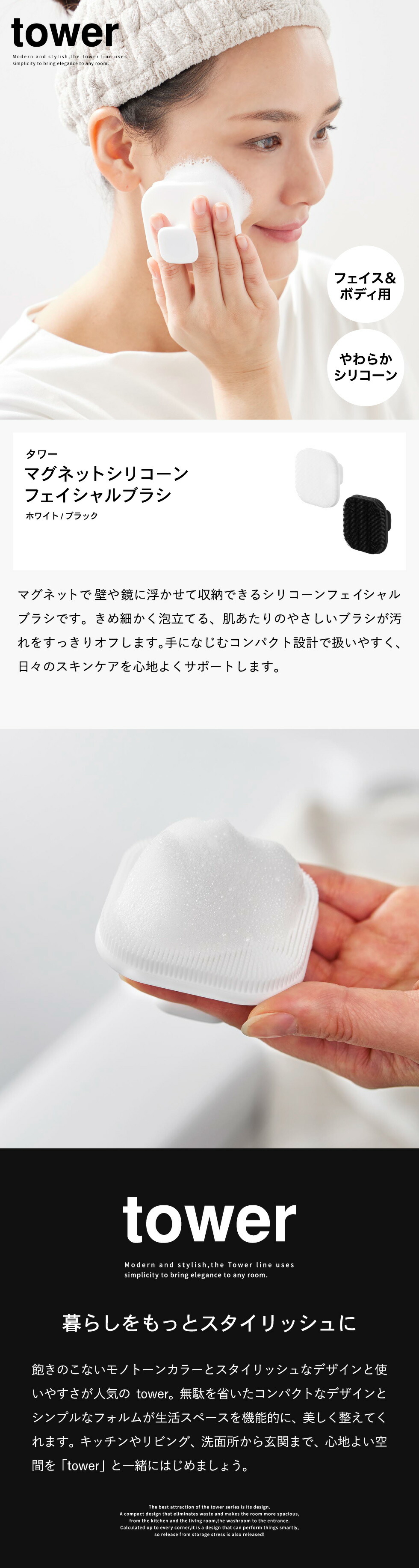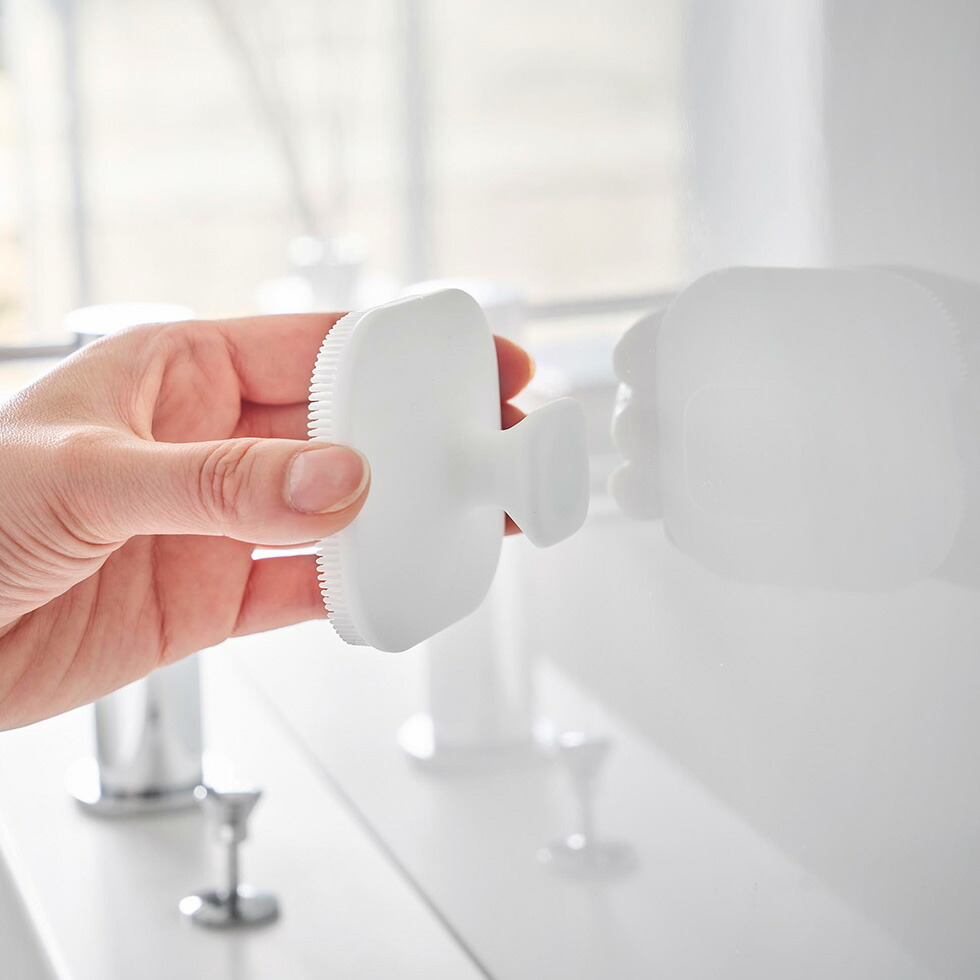 マグネットで浮かせて、簡単収納。きめ細かく泡立つ、やわらかいシリコーン製のフェイシャルブラシです。手に収まるサイズ感で、肌にやさしく洗顔できます。「フィルムシートマグネット用ベース タワー(別売)」を使用すれば、タイルなどの壁面にも収納可能です。