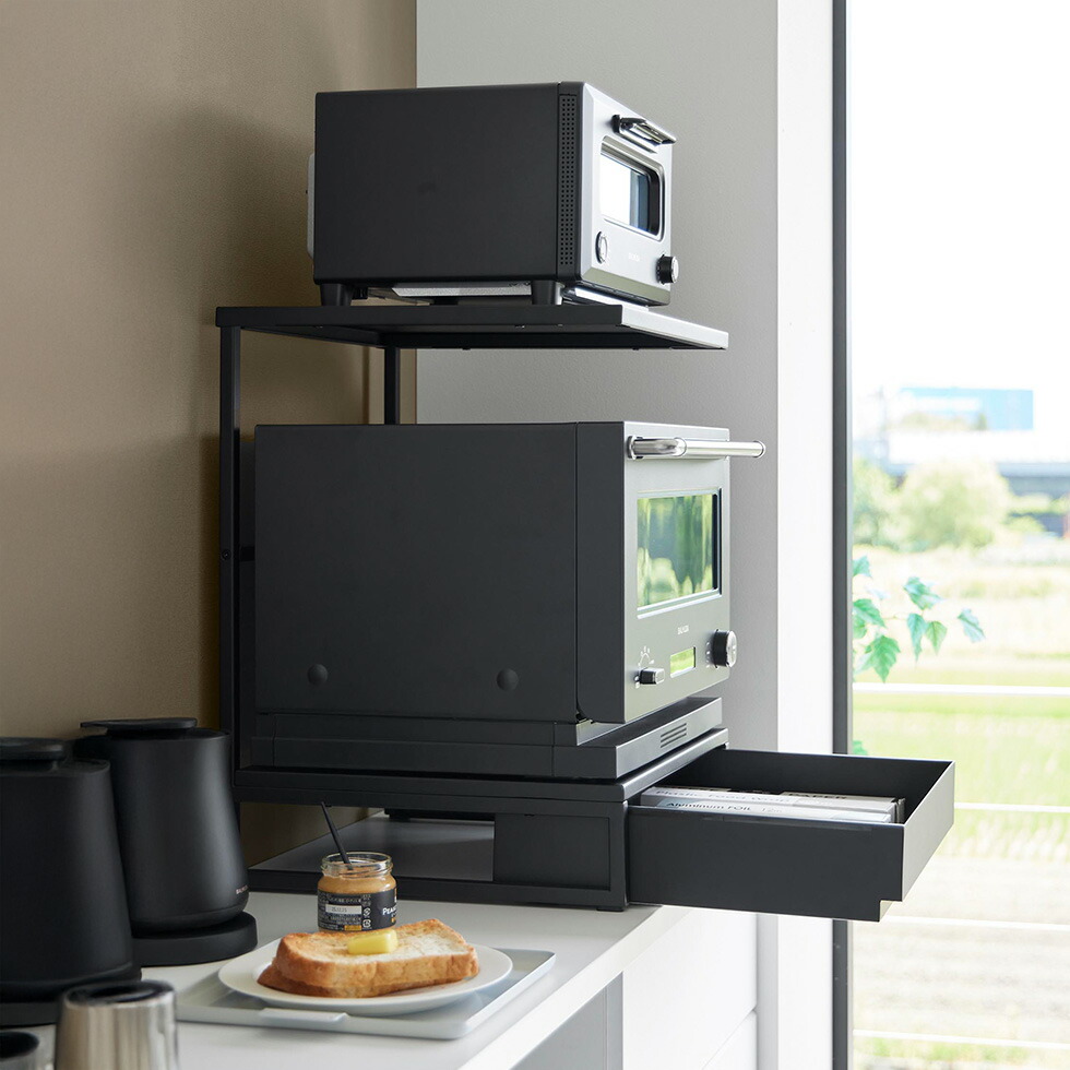 電子レンジやトースターなどキッチン家電を、省スペースにまとめて設置できるキッチンラック2段です。高さのある引き出し付きで、電子レンジ周りのキッチン小物をたっぷり収納できます。必要な物をスムーズに取り出せて便利です。