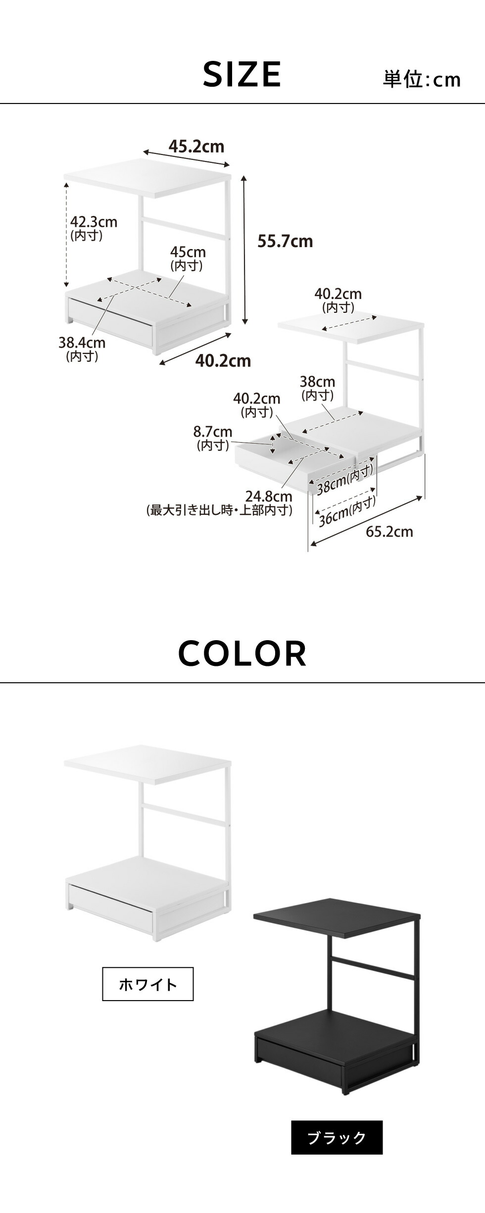 ●内寸サイズ:約 上棚:W45.2×D40.2cm 置き台:W45×D38.4×H42.3cm 引き出し:W40.2×D38×H8.7cm(開口部最大D24.8cm)