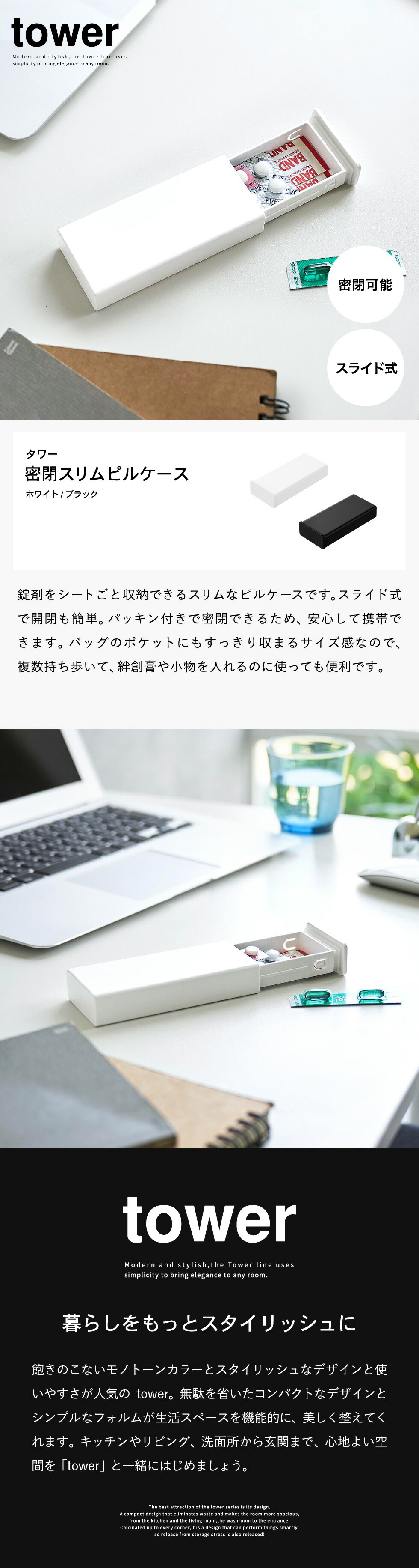 密閉スリムピルケース タワー 山崎実業 tower 公式 10662 10663 ホワイト ブラック