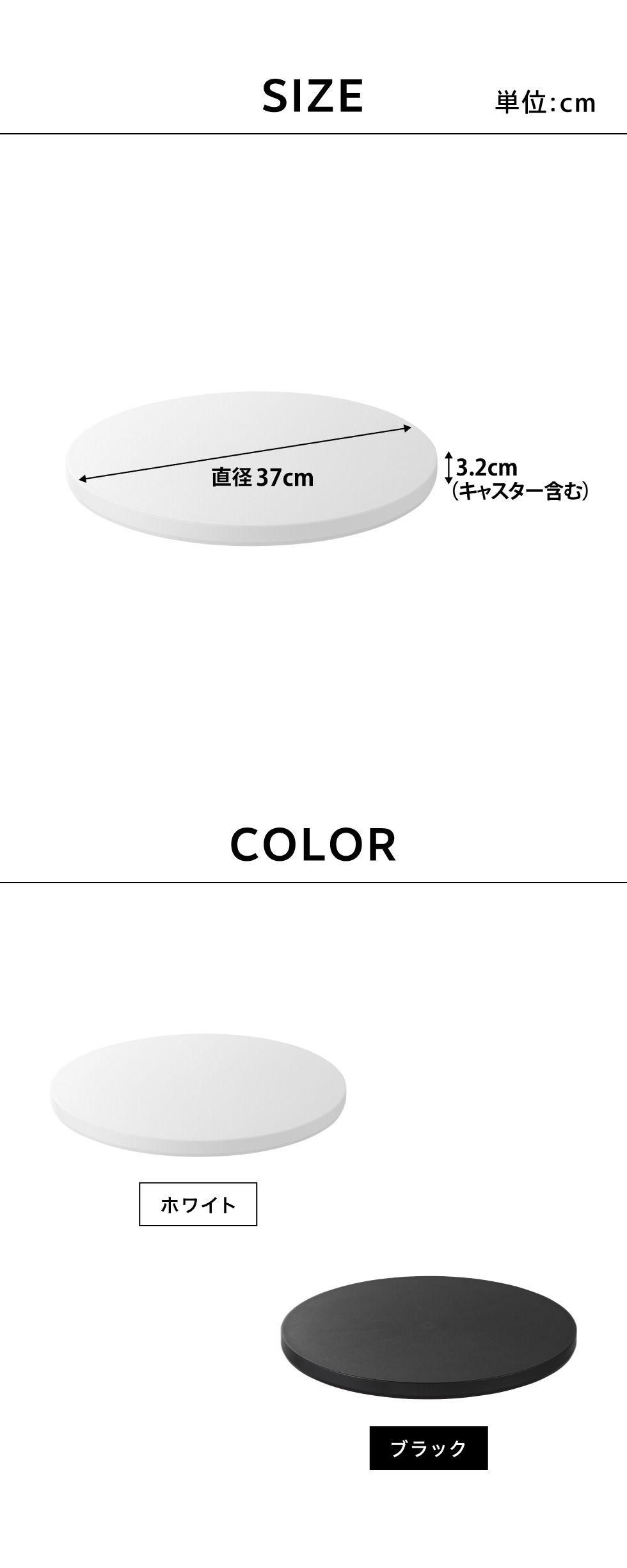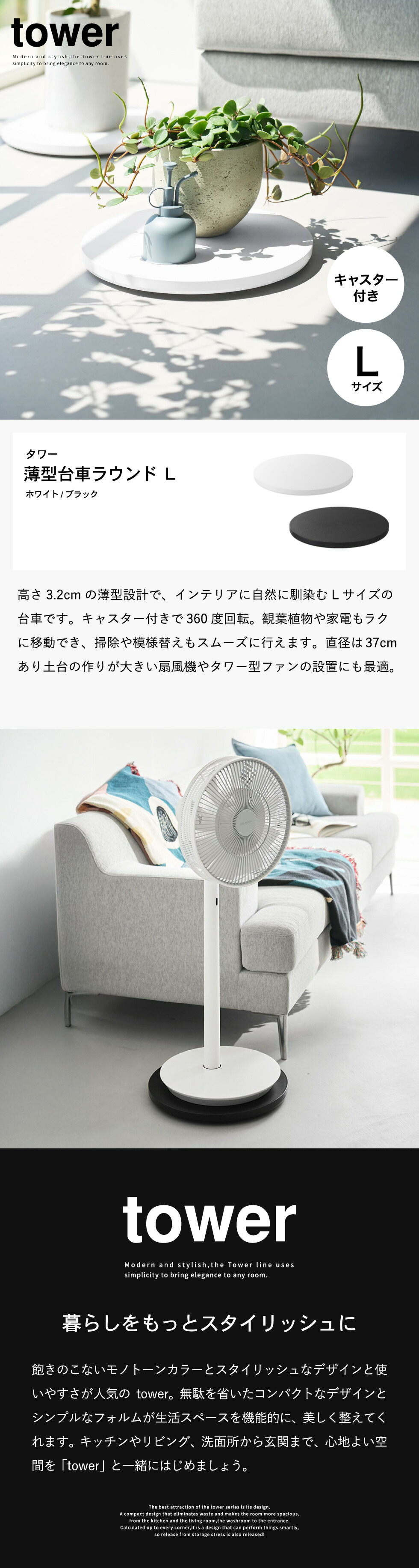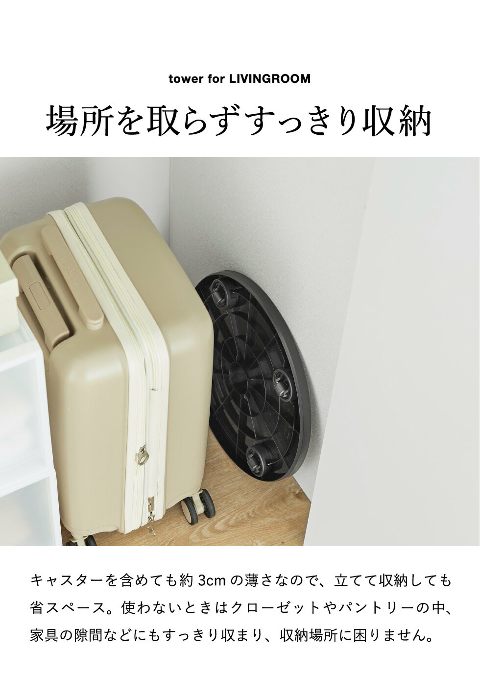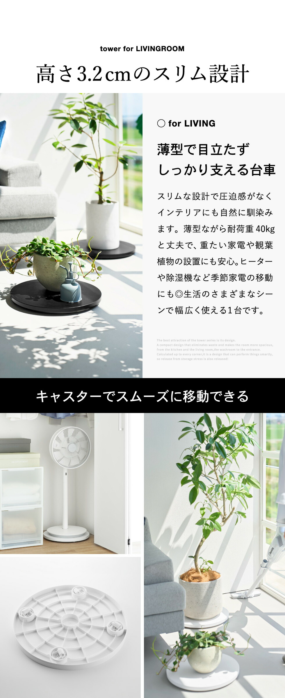 高さ3.2cmの薄型設計で、インテリアに溶け込むすっきりとしたデザインの台車です。薄型キャスターが360度回転するので、重い鉢植えの観葉植物や家電もラクに移動でき、掃除や模様替えもスムーズに行えます。直径37cmで、サーキュレーターやタワー型ファンの設置にも最適。オフシーズンの家電をクローゼットに収納する際にも便利です。薄型なので省スペースに収納可能。簡易的なローテーブルとしてもお使いいただけます。