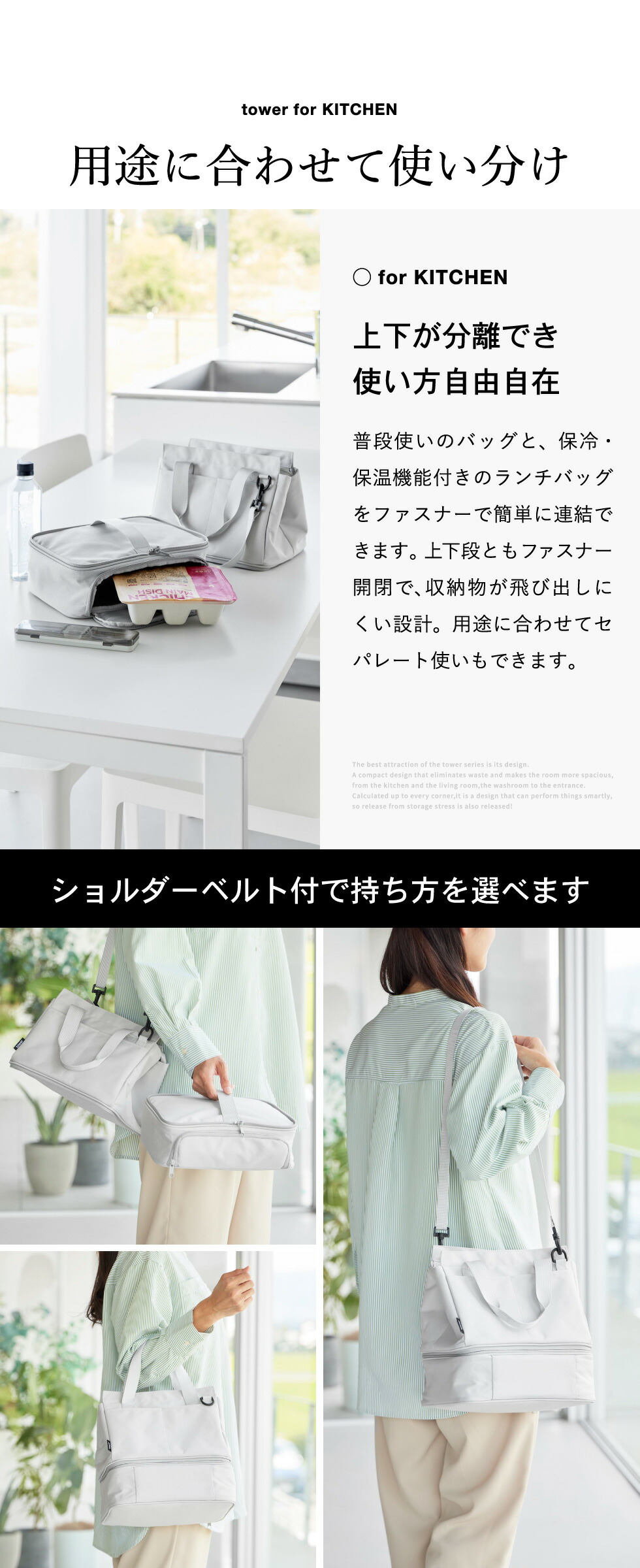 用途に合わせてセパレート使いができる、便利なランチバッグです。下段は取り出し口が大きく開くので、お弁当を傾けずに収納でき、出し入れもスムーズ。カトラリーを固定できるゴムバンド付きで持ち運びも安心です。500mLのペットボトルが3本収納可能で、おうちで丸洗いできるため、いつでも清潔に保てます。※下段バッグのみの仕様です。上段は普段使いのバッグとしても活躍します。ファスナー付きで中身が見えず安心。外ポケットが2つ付いており、小物の収納にも便利です。バッグサイドのボタンでサイズ感を調整でき、シーンに合わせてスリムにも。ファスナー仕様により、上下を簡単に分けてセパレート使用が可能です。※バッグ(下段)のみ保冷・保温機能があります。