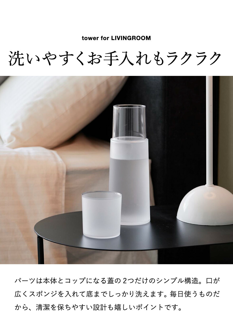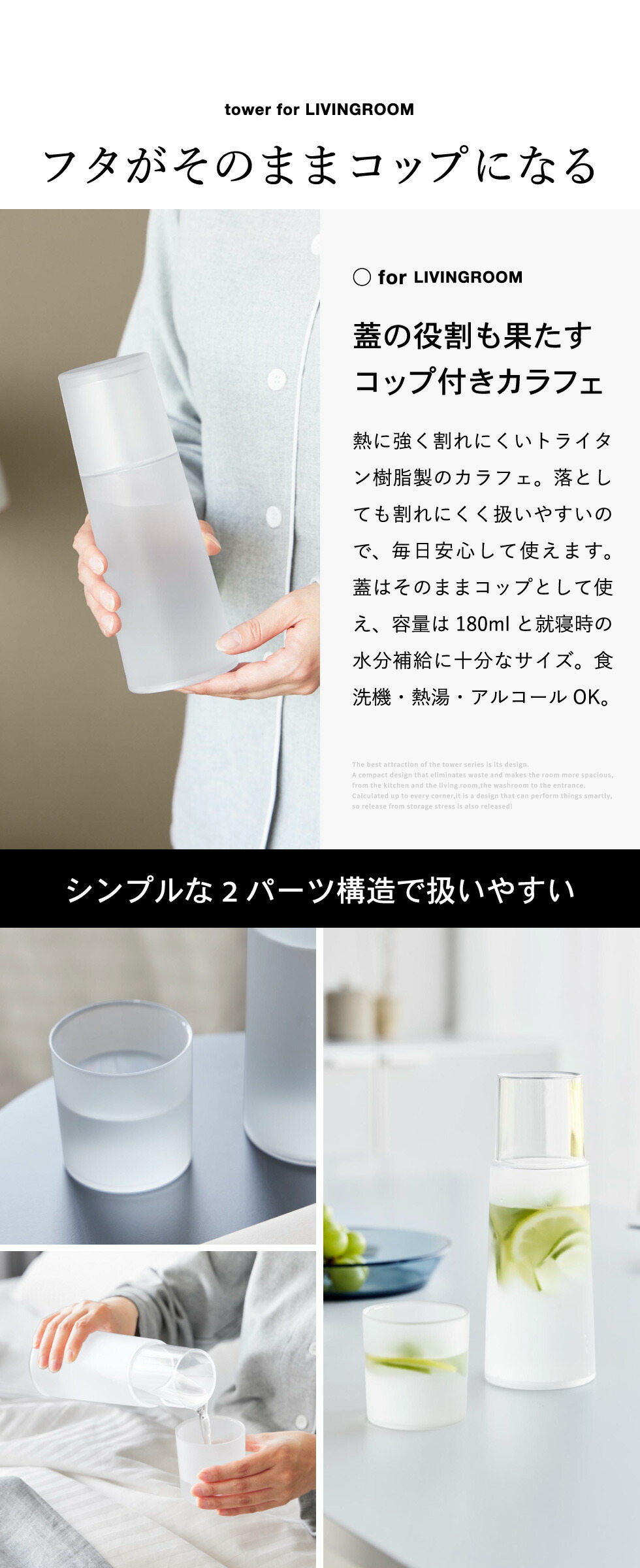 就寝時の水分補給に便利な、ベッドサイドカラフェです。熱に強く割れにくいトライタン樹脂製で、お好みの飲み物を入れて普段使いにも活躍します。蓋にもコップにもなるシンプルでスタイリッシュなデザイン。大きな注ぎ口で注ぎやすく、お手入れも簡単です。食洗機OK。熱湯OK。アルコールOK。※人体に影響する可能性が示唆される化学物質(BPA)を含まず、強度、透明度、耐熱性がある【イーストマン Tritan(TM)】【トライタン(TM)】を使用している安全な製品です。