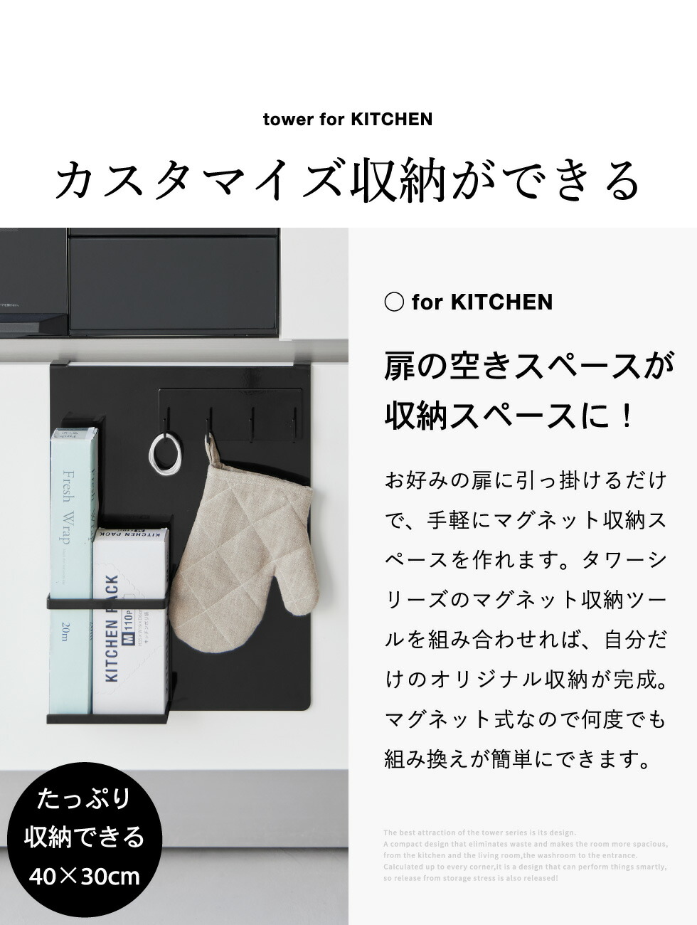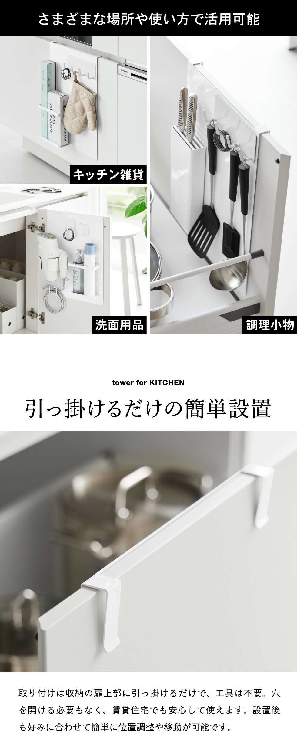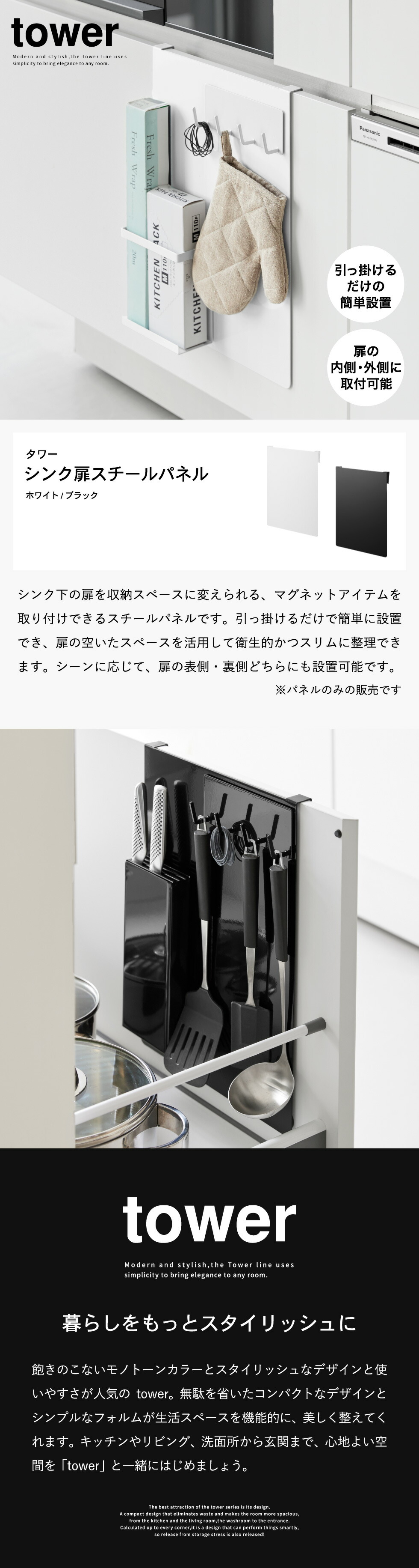 シンク下の扉を便利な収納スペースにできる、マグネットアイテムを自由にカスタマイズできるスチールパネルです。引っ掛けるだけで簡単に設置でき、シンク扉の裏側に衛生的でスリムに収納できます。キッチンツールを手に取りやすく整理でき、表側に設置してよく使うアイテムを収納するのも便利です。