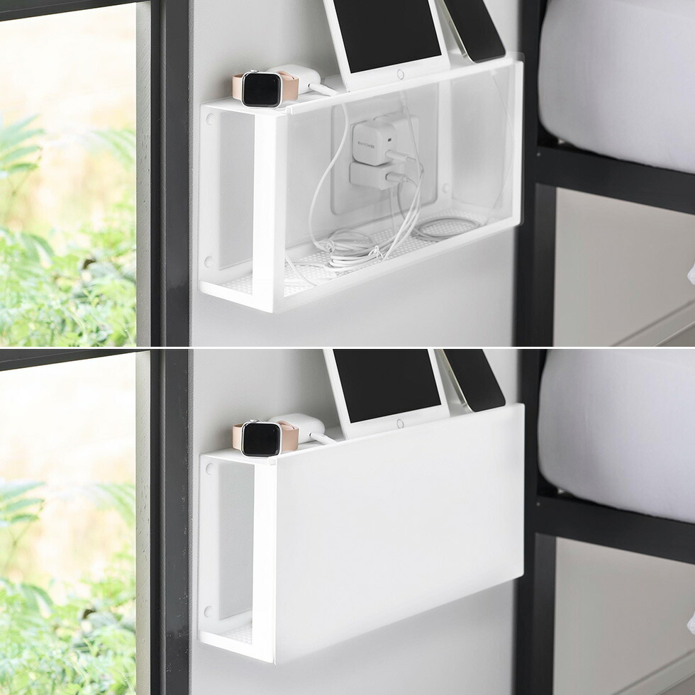 置き場所に困るルーターやケーブルをコンセントごとすっきり隠して収納できる壁付けラック。天面は小物置きとしても活用可能。石こうボード壁対応 スマホ タブレット イヤホン