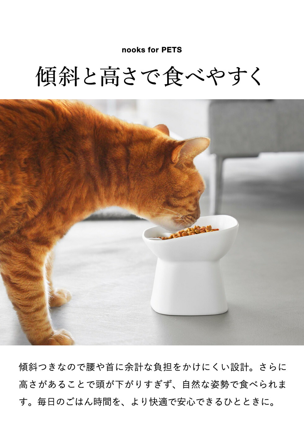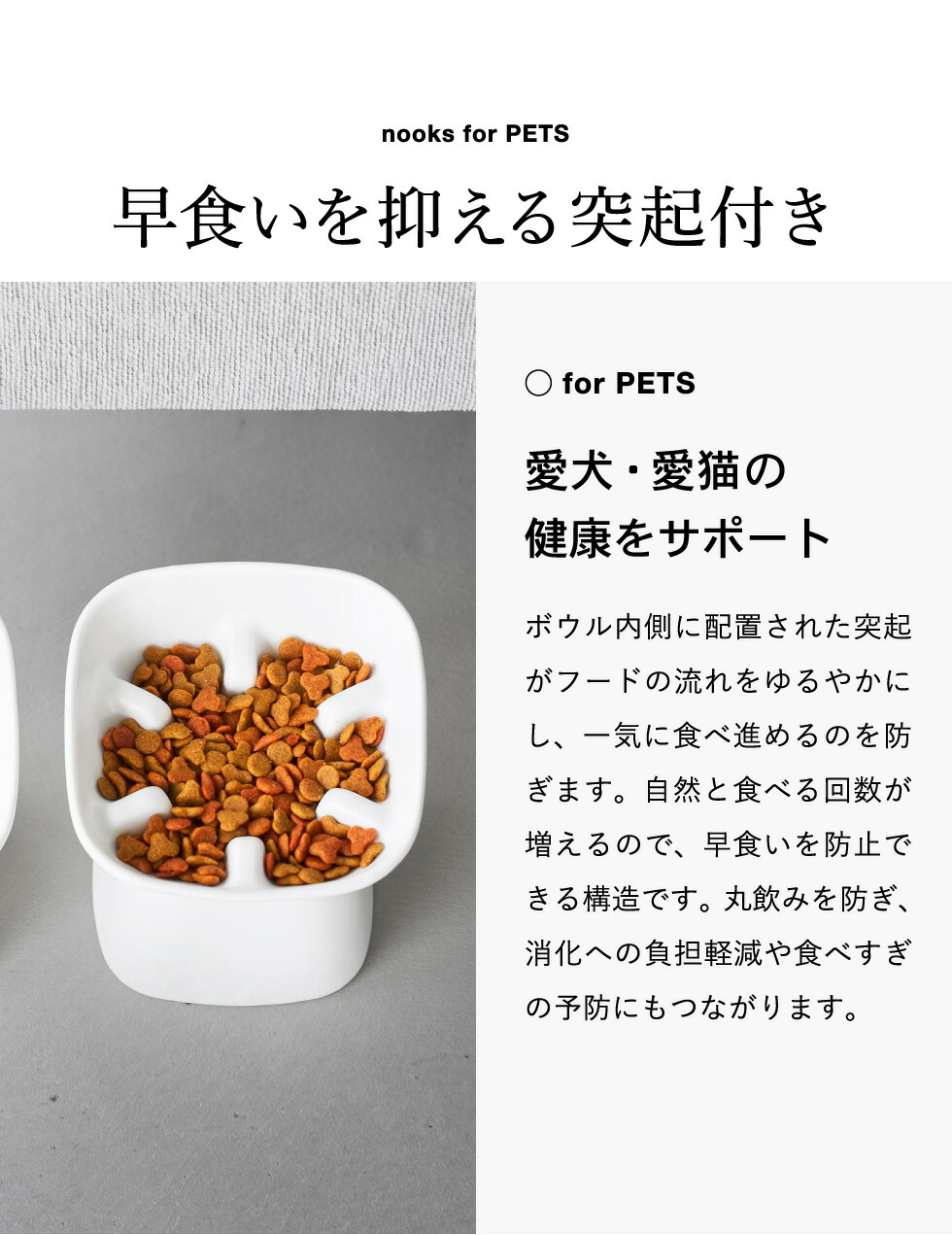 傾斜がついた高さ11.5cmの食べやすいフードボール。突起付き形状で早食いしにくく少しずつ噛んで食べやすい構造。愛犬・愛猫に合わせて高さや容量を選べます。食洗機OK。電子レンジOK。