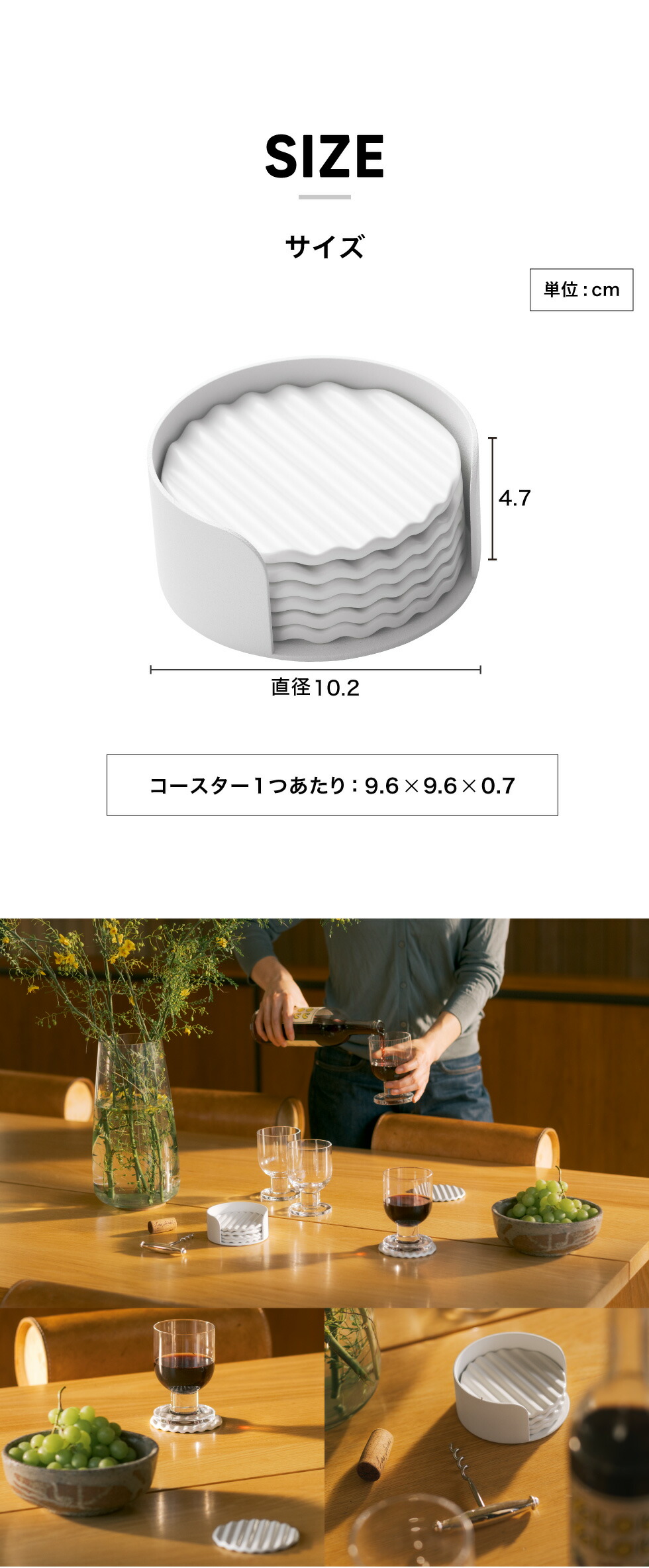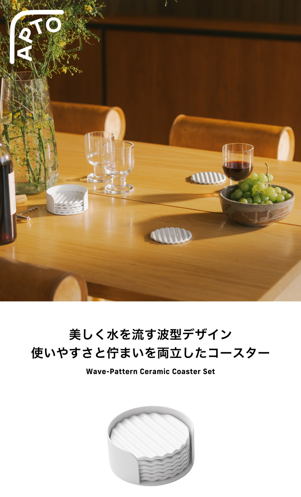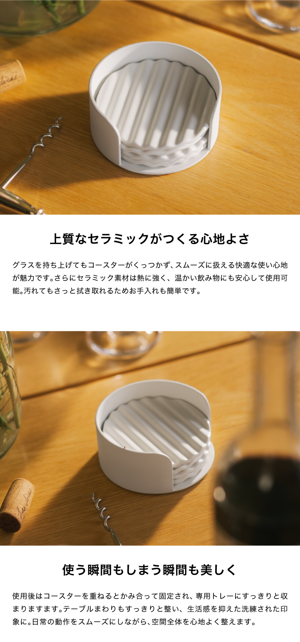 セラミック製の6枚のコースターは、波型形状により水はけがよく、安定感にも優れています。コースターを重ねると上下でかみ合ってピッタリと固定され、専用トレーにスマートに収納できます。