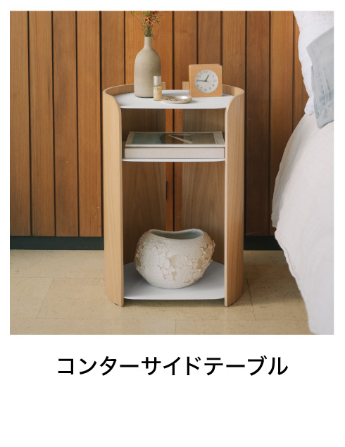 NY発のハウスウェアブランド「APTO」のサイドテーブルです。温かな木の質感を活かした曲線のフォルムとスチールの棚板を組み合わせた、様々な空間に馴染むデザイン。背面には開口部があるので、照明やスマートフォンの配線もスッキリ。洗練されたスタイルと機能美を兼ね備えた、ただそこに置くだけで日常が心地よく整うアイテムです。